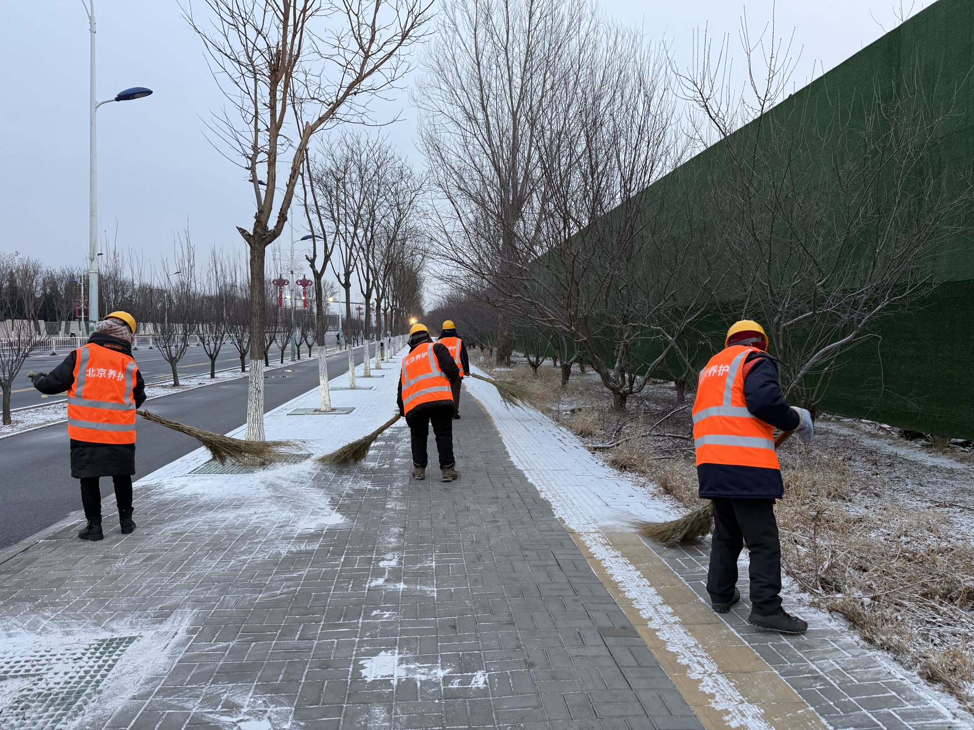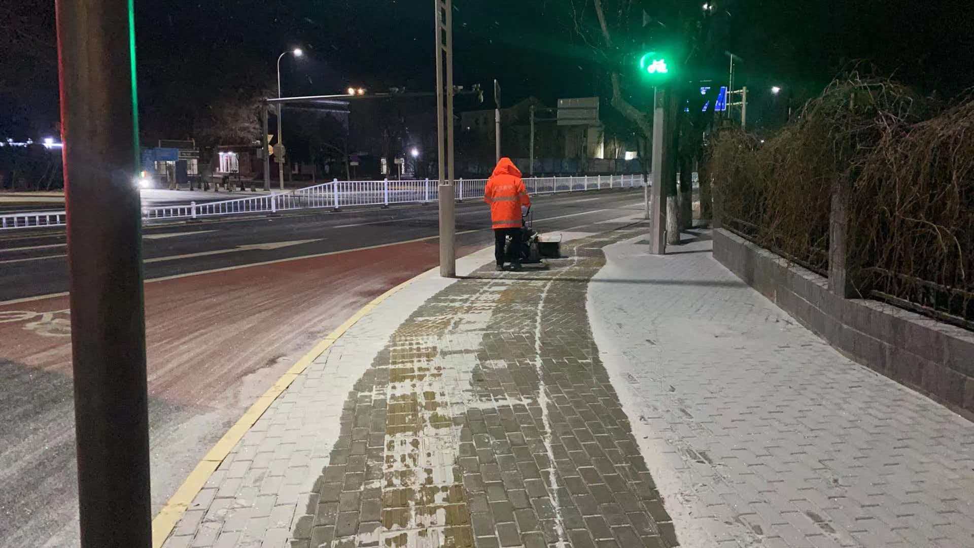 在保障机动车通行的同时,延庆公路分局聚焦市民步行出行安全,对管养范围内13条道路、总面积219815平米的步道科学划分为5个作业组,配备充足专业机械设备定向攻坚。18日凌晨5时,天还未亮,步道除雪作业人员已全部到岗,他们手持除雪工具,在兴阳线、延康路、妫川路等积雪较重的步道上忙碌,凛冽寒风中,铁锹与地面碰撞发出清脆声响,一点点清除步道上的积雪积冰,重点清理防滑纹理内残留冰雪。至早晨7时,所有积雪步道清理完毕,为市民开辟出安全通畅的步行通道。