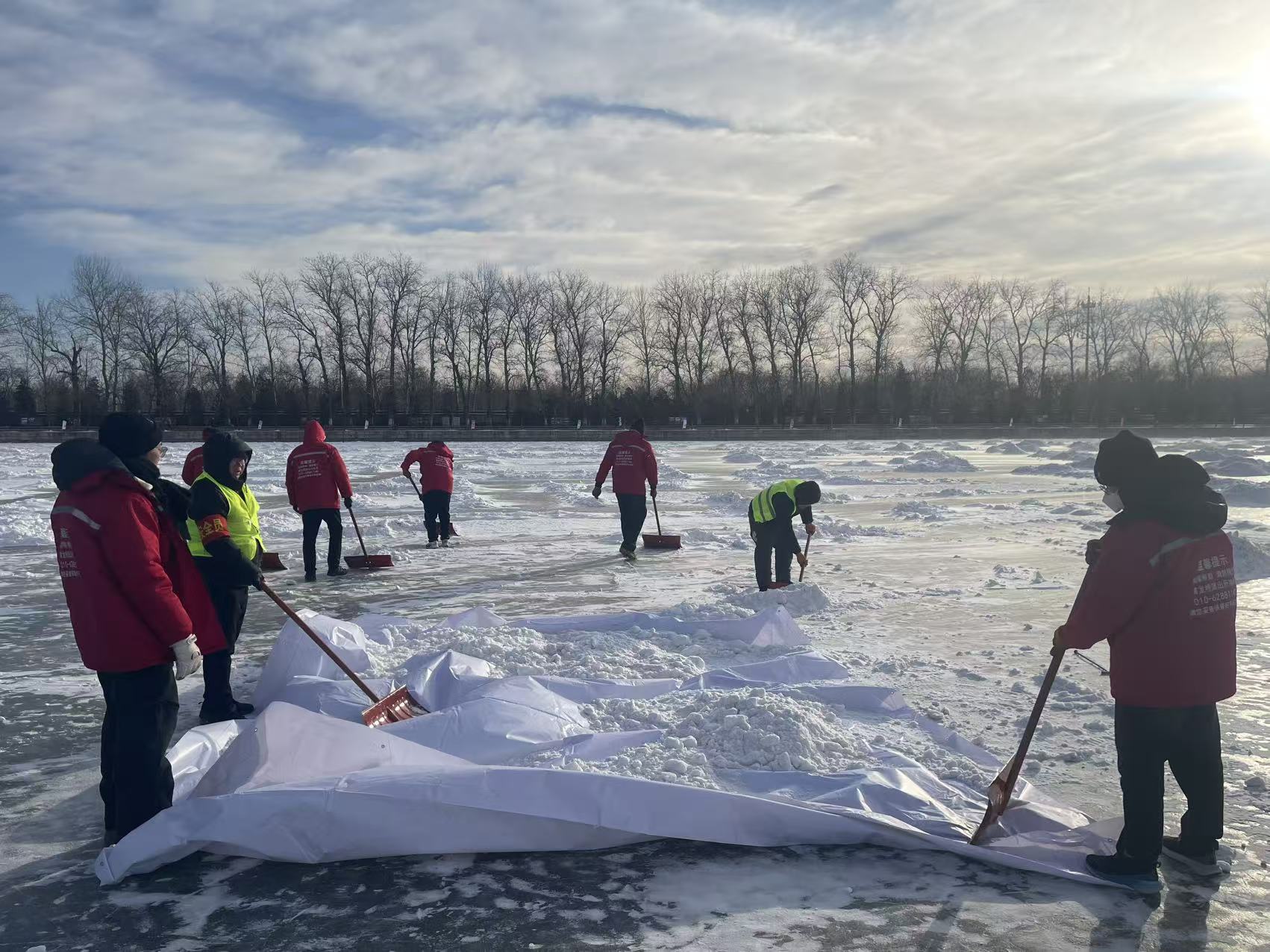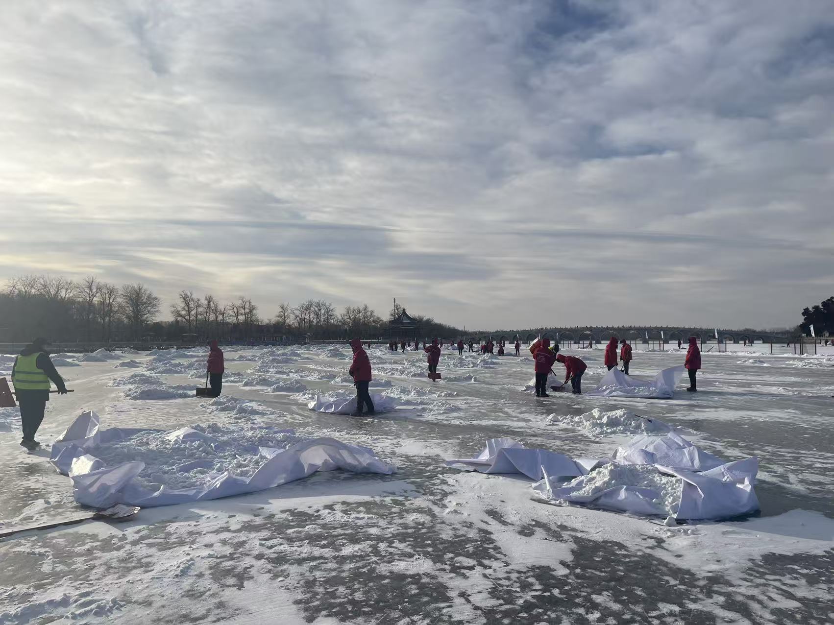 颐和园16万平方米的巨大冰面,是此次清雪工作的最大挑战。由于机械车辆无法上冰作业,所有清雪工作均需依靠人工完成。颐和园迅速集结200余名工作人员,手持雪铲等工具开展地毯式清理。考虑到冰层承载安全,积雪不能集中堆放,工作人员需将积雪分散转运至游客非活动区域,进一步增加了作业量和耗时。