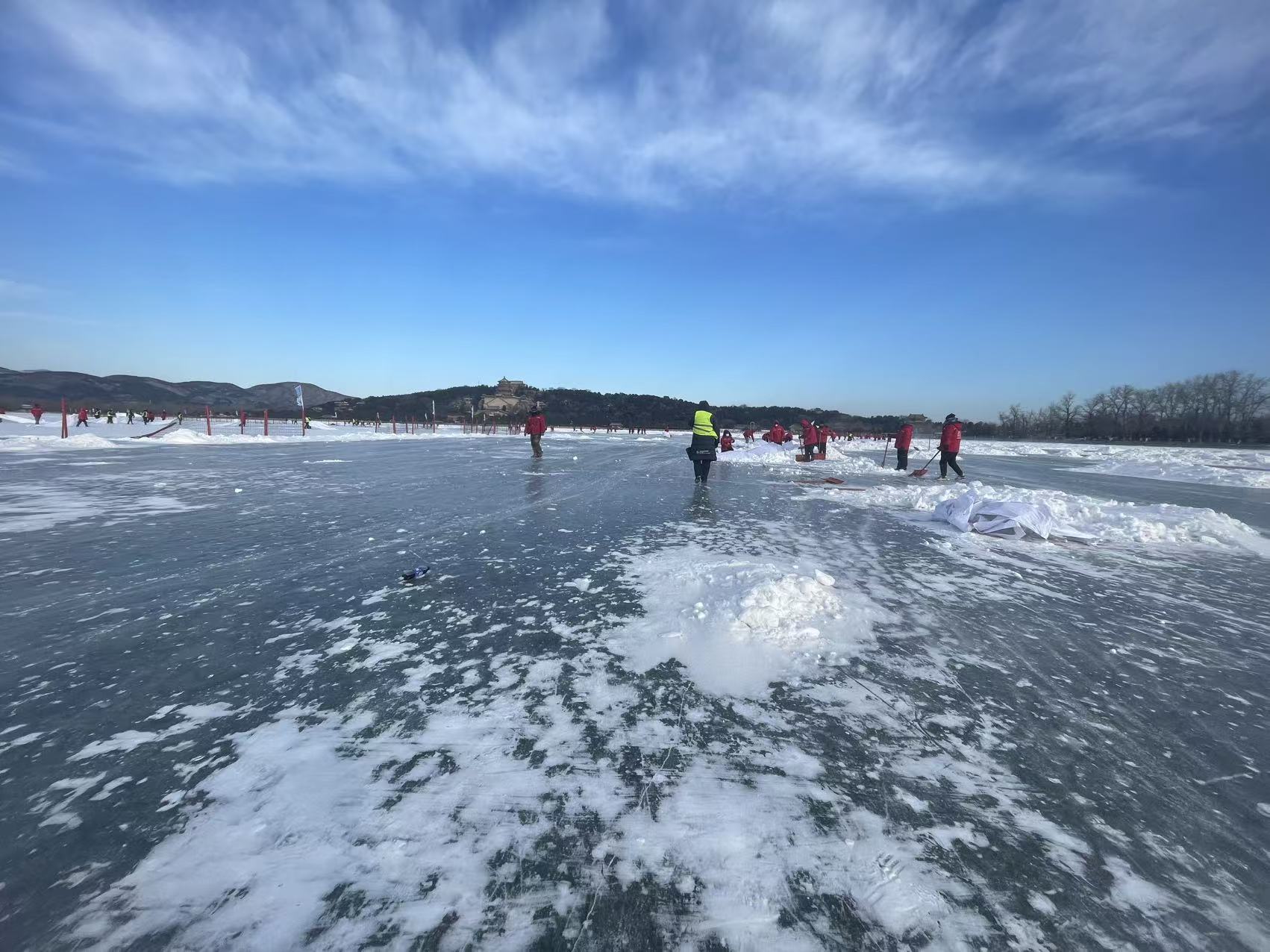 然而,冰场开放次日便遇到2026年首场持续降雪。17日11点,公园就已启动清雪,但当晚降雪持续,到了18日清晨,冰面积雪厚度已经有10厘米了。远远望去,白茫茫一片,昆明湖仿佛盖上了一层厚厚的棉被。
