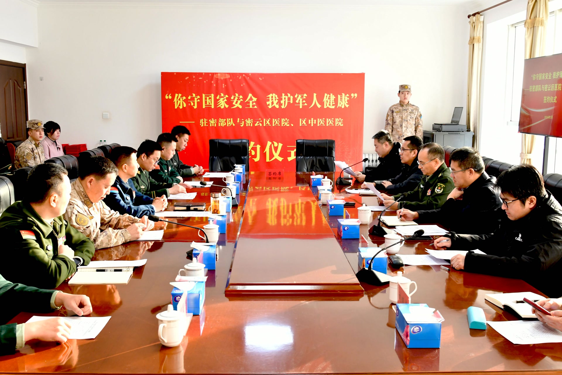 近日,密云区双拥(退役军人)工作领导小组办公室联合区武装部、区卫健委、区退役军人局等部门,在驻密某部举行“你守国家安全、我护军人健康”暨驻密部队与密云区医院、中医院军地医疗保障合作签约仪式。