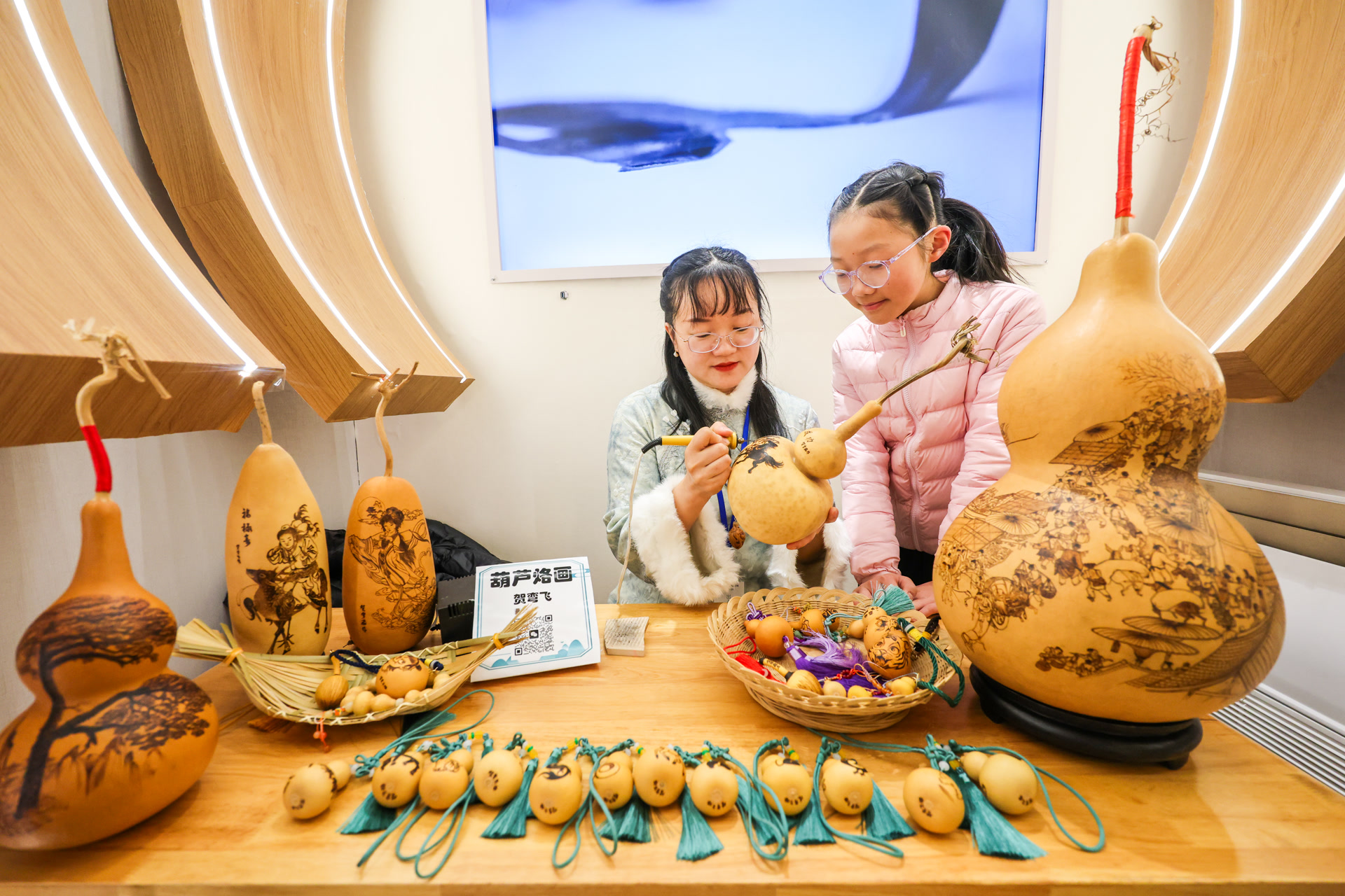 安徽体验区,葫芦烙画摊位前,工作人员贺弯飞边演示边介绍:“烙铁是硬的,葫芦也是硬的。因此葫芦烙画是‘硬碰硬’,烙起来并不容易。在创作时,要先用铅笔打草稿,利用烙铁的温度来控制画面的颜色,关键是手要稳,保持匀速。”