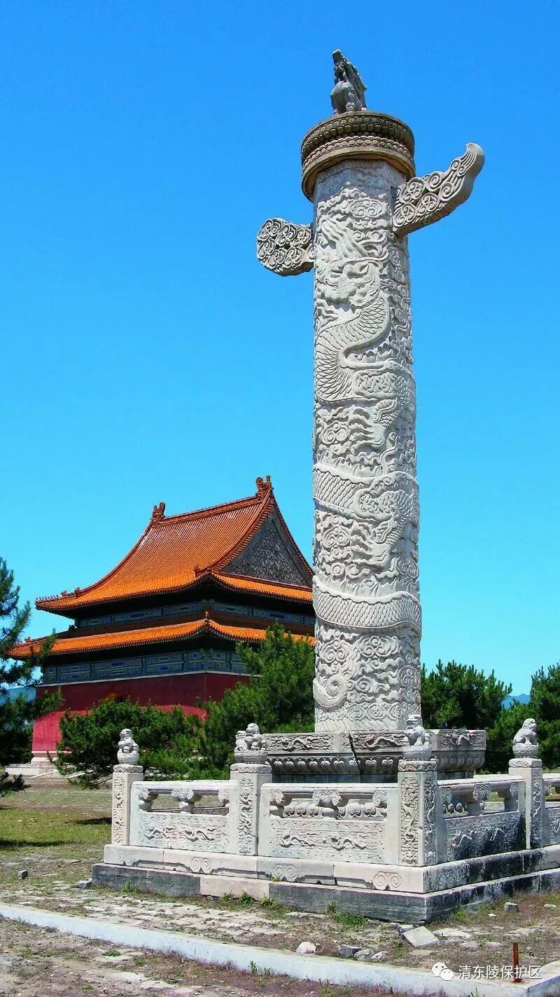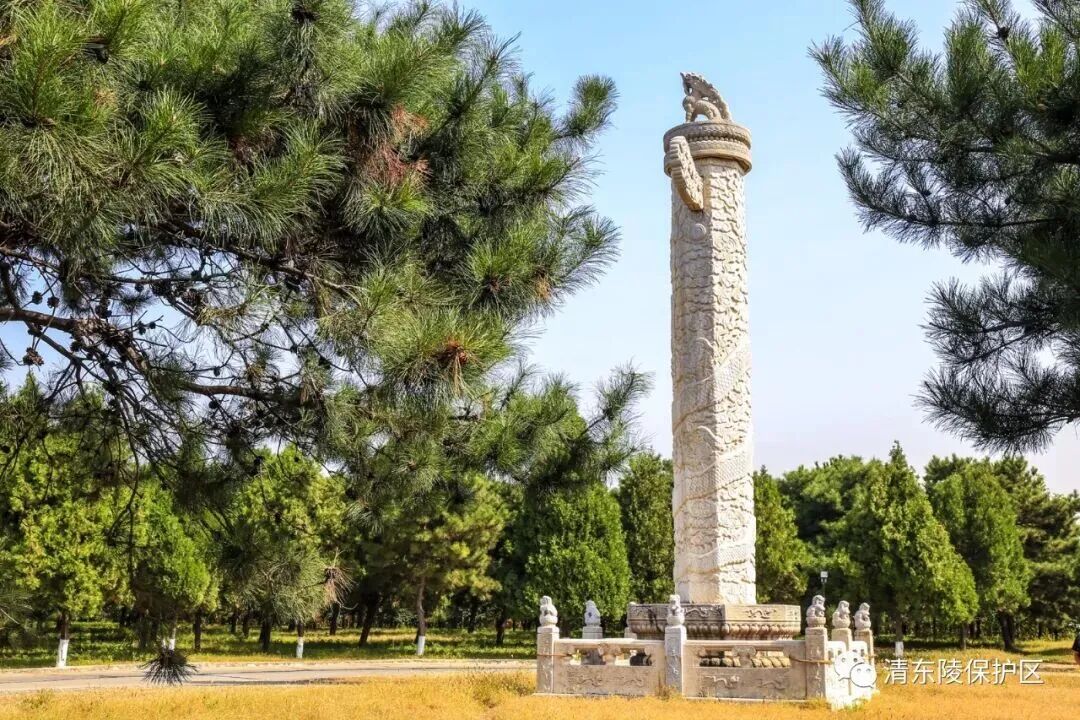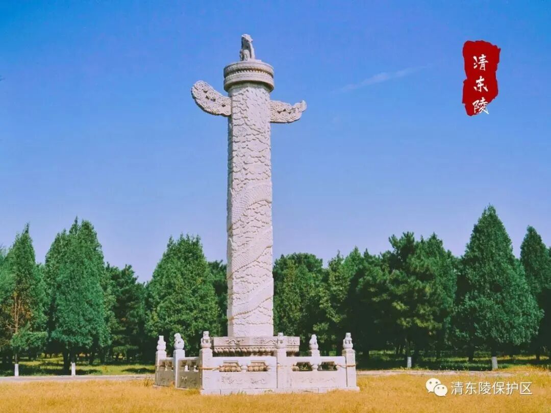 在清东陵里与华表相对的还有另外一种建筑形式,与华表迥然不同,一般称之为望柱。当我们沿着神路,绕过影壁山,蓦然望见了庞大的石像生群前面两根高耸的六棱石柱,屹立于六角须弥座之上,这就是望柱。