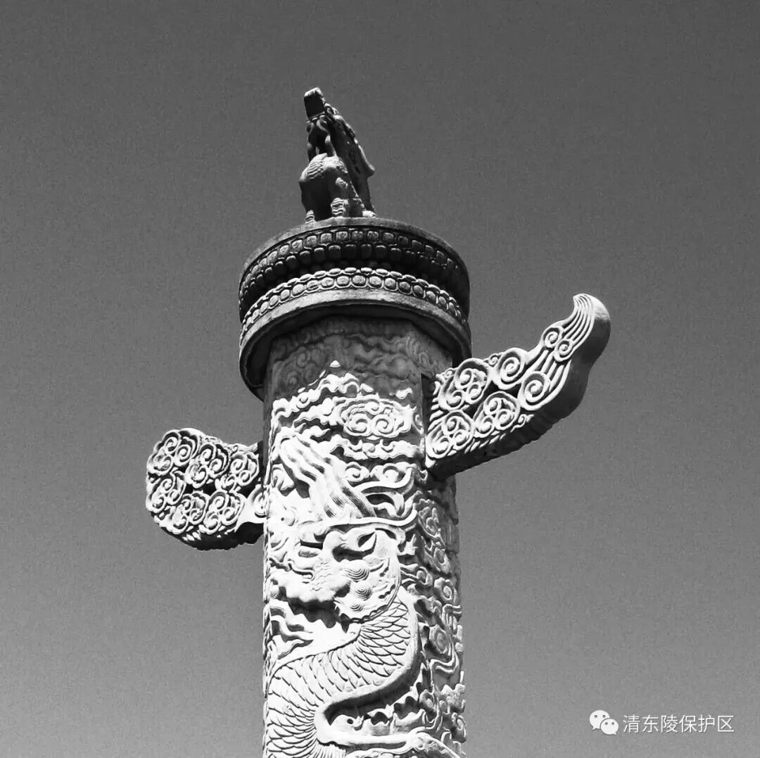 望柱的柱身下端雕海水江崖,柱身满布宝气祥云,承露盘上状似穹顶的柱头之上雕刻着祥云行龙。一柱擎天,简捷明了,毫无累赘。这样的望柱,清东陵还有四组,分别是景陵、裕陵、定陵石像生前,和惠陵大海墁之泊岸下各一组。除去惠陵望柱围以勾栏外,余则未设置。