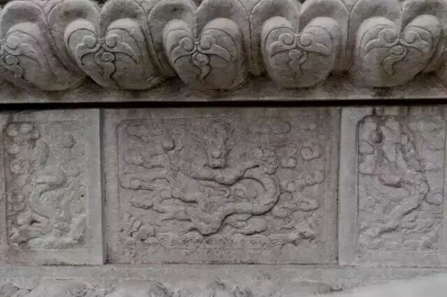 对于华表,谁都不会陌生。因为我们都从不同的渠道见过天安门金水桥外的华表。这里的华表长得同天安门华表相似。约高2米的八角石雕须弥座上矗立着高约8米的八棱石柱,柱子上部透插云板。柱顶承露盘上圆雕一条蹲踞而坐,昂首望天的蛟龙,俗称望天吼。自承露盘底至蹲龙上唇约高2米。这样通高可达12米左右。柱外四周围以白石勾栏,8柱,8板,护持着华表。这组石雕作品不仅气宇轩昂,而且雕刻十分精美。柱基须弥座上、下枋雕二龙戏珠,上、下枭雕仰俯莲,束腰雕正龙。柱身一条升龙盘绕升腾,遨游于祥云之间,气势磅礴。围栏望柱,柱身两侧镌刻升龙,柱顶圆雕坐狮。寻杖栏板瘿项雕云朵宝瓶,板面内外侧雕二龙戏珠。所有雕刻生动传神,堪称佳作。