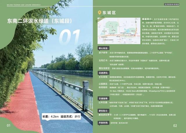绿道位于东城区东南二环护城河北岸,沿明代南护城河规划建设,全长约4.2公里,以 “城、河、园、馆” 深度融合为核心特色,串联永定门、天坛等重要文化地标,是沉浸式体验老北京历史文脉的滨水休闲绿道,适用于亲子研学、休闲慢步及古风摄影等多元场景。