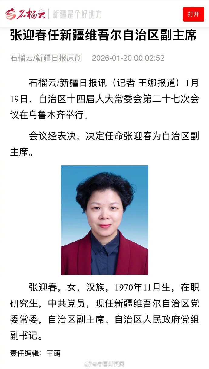 张迎春,女,汉族,1970年11月生,在职研究生,中共党员,现任新疆维吾尔自治区党委常委,自治区副主席、自治区人民政府党组副书记。