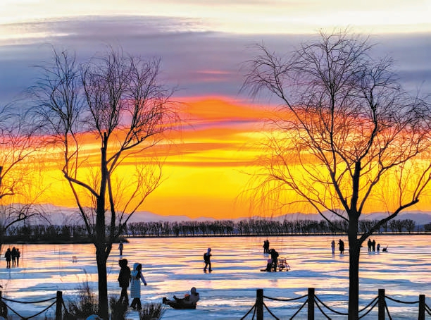 往南走,养生式的冰雪休闲同样安排上了。在野鸭湖国家湿地公园,广袤的天然冰场免费向游客开放。滑冰车、赏落日、观候鸟,成为冬日里最惬意的休闲方式。每天16时是“黄金光线”拍摄时段,吸引着众多摄影爱好者记录下夕阳染红冰面、映照芦苇荡的绝美瞬间。