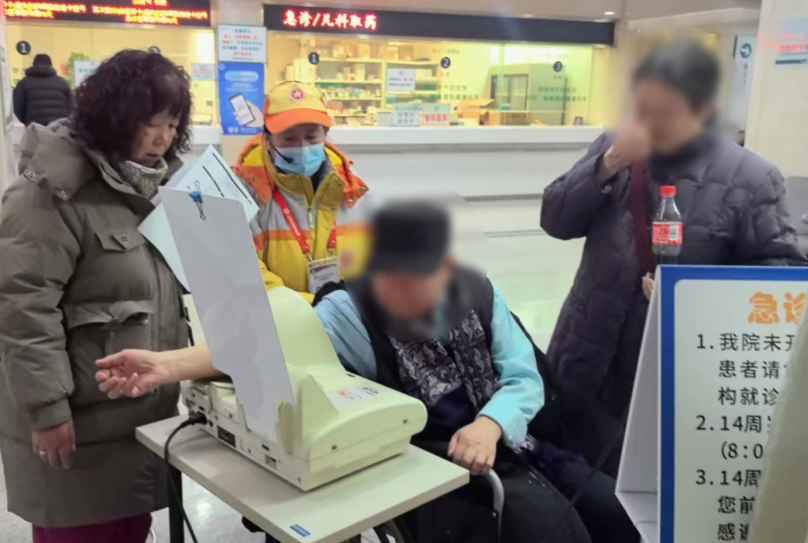 抵达医院后,三人分头忙碌起来:挂号、联系家属、陪同检查……得知丁先生患有耳石症,她们帮忙挂上了耳鼻喉科的号。候诊期间,丁先生突然呕吐,郭彩霞连忙找来垃圾桶,并轻声安慰。经医生诊断,丁先生除耳石症外,还需进一步排查脑梗风险。