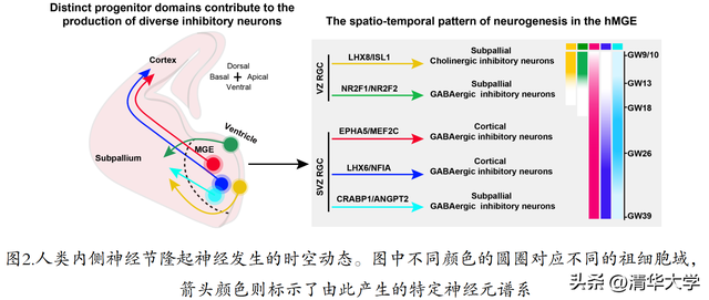 人类大脑神经元的惊人多样性是支撑高级脑认知功能的根本基石。人类大脑中数量巨大、种类繁多的神经元是如何由数量和种类都相对有限的神经干细胞有序产生的,是神经科学领域的重要科学问题。该研究系统绘制了人类胎儿MGE脑区的神经发生时空图谱,揭示了人类大脑抑制性神经元多样性产生的核心机制。研究发现人类MGE中存在高度区隔化的神经祖细胞域(progenitor domain),并且该祖细胞域与多种抑制性神经元谱系之间具有明确对应关系。同时,研究揭示人类MGE中的神经发生具有严格的时空规律:发育早期,位于脑室区(VZ)的LHX8/ISL1+和NR2F1/NR2F2+祖细胞域率先进行神经发生;发育后期,位于脑室下区(SVZ)的EPHA5/MEF2C+,CRABP1/ANGPT2+和LHX6/NFIA+祖细胞域成为了主要的神经发生场所。这些结果表明,在人类大脑发育过程中部分抑制性神经元类型的身份早在祖细胞阶段就已建立,并受到其“出生地”和“出生时间”的严格限制。
