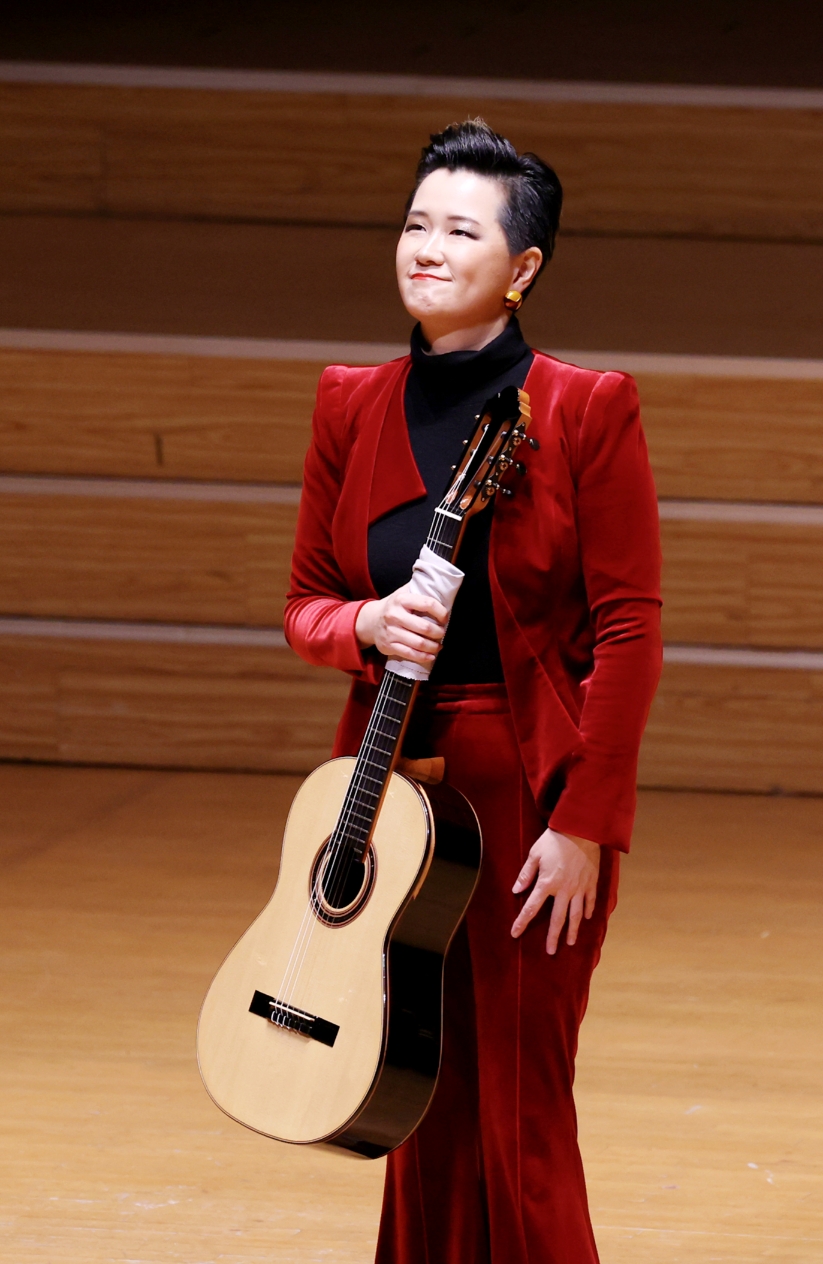下半场音乐会进入当代语境。谭盾《七个欲望》以鲜明的节奏和音色对比,拓展了古典吉他的声音边界,拨弦、敲击与音响残响交错出现,音乐不再线性推进,而是以片段化方式呈现内心感受。强越《回声的吟唱》(2025)迎来亚洲首演,简约动机不断回旋、延展,仿佛声音在空间中被反复折射。阿萨德《水彩画》最终为音乐会收尾,三首短小乐章如同不同色彩的音响速写,留下轻快明亮的余韵。