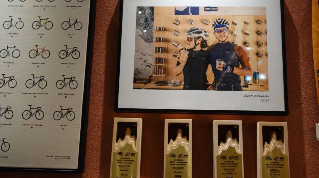 2019年,历经改造的隆福寺重新开业,这家小馆成为第一批入驻隆福大厦的商铺。夫妻俩更像是一对满怀热忱的“街区共建者”,店里从菜单设计到装修布置,都藏着他们的故事与巧思。一整面墙上挂满两人骑行远征的照片和奖牌;两根高耸的红砖柱子是他们精心挑选的材料;嵌入墙壁的架子顶上,一个老式挂钟静默走动——那是高大美姥姥的陪嫁,它静静地诉说着过往,又见证着新故事。
