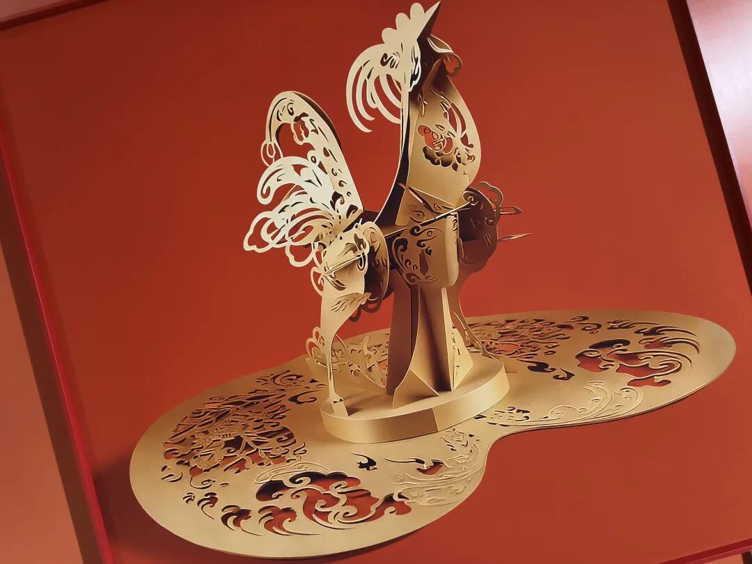 作品可收合展开,凭借纸自身的动力呈现动态之美。合为半桃,展则化为高歌的金色雄鸡,寓意“鸡鸣喜报”,身饰祥云,象征鸡年如意。底部展开呈心形,缀以传统镂空纹样,传递友爱、吉祥与美好。