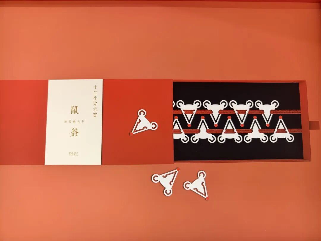 作品灵感源自歇后语“老鼠钻书箱——咬文嚼字”,以简洁的圆与三角几何图形勾勒出鼠的形象,转化为一枚精巧的书签。其上的红色圆形标记点可精准索引字句,为阅读增添便捷与趣味。