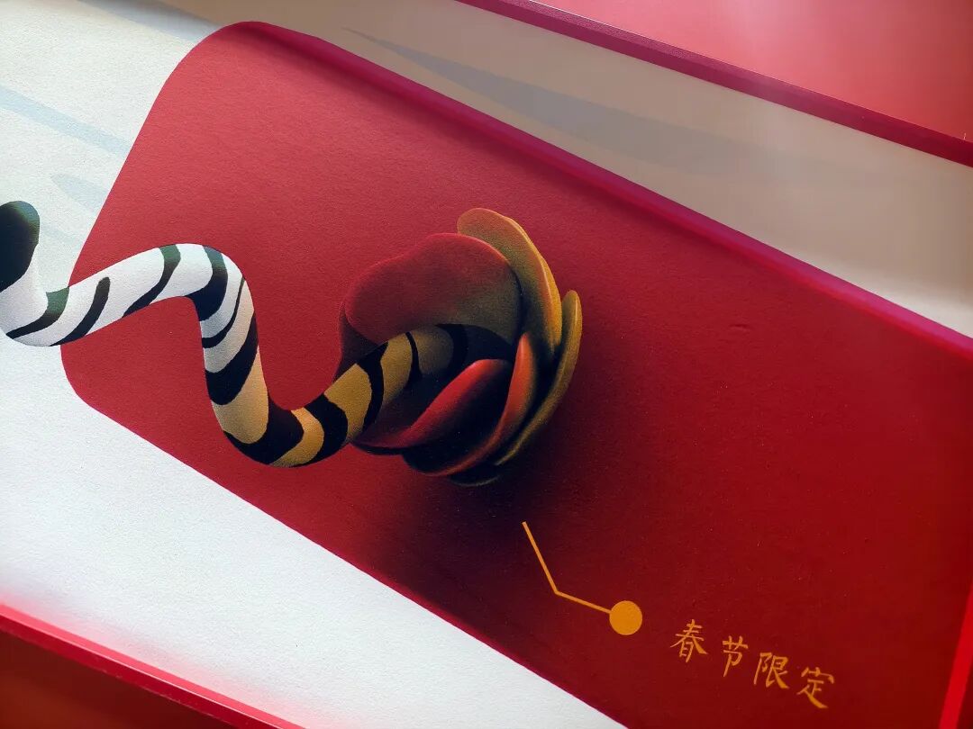 拿着这根棒棒糖是童年,也是年味儿。将灵蛇盘绕之姿凝练为棒棒糖造型,螺旋纹理寄寓“团圆美满”的当代温情。“甜”既是味觉体验,亦象征团圆年味与绵长的幸福寓意。