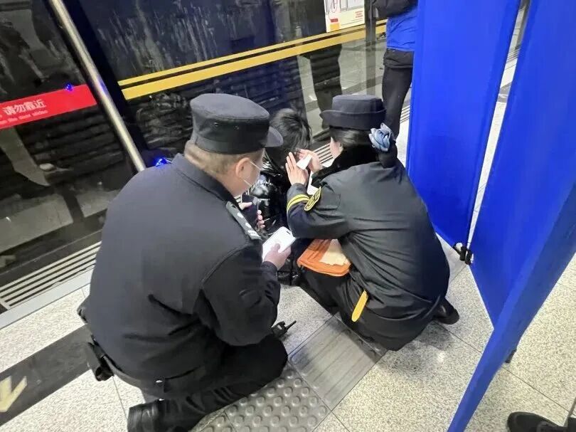 这惊心一幕,被站务员杨建臣发现。“站长、站长!下行站台6门有乘客晕倒,赶紧来!”杨建臣一边按住肩头的手台汇报,一边快速冲到乘客身边。扶起乘客时,他放缓了动作,边轻声安抚着,边将乘客移到站台门旁安全位置,同时用手台完成现场情况续报。