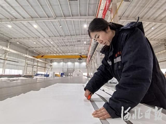 1月12日,在位于张家口冰雪运动装备产业园的河北米锐特气模制造有限公司厂房内,30米长的不锈钢操作台上,工人正精准划线、细心裁剪。裁剪后的材料经过热力粘贴等处理,最终变成一件件形态各异的气模成品。