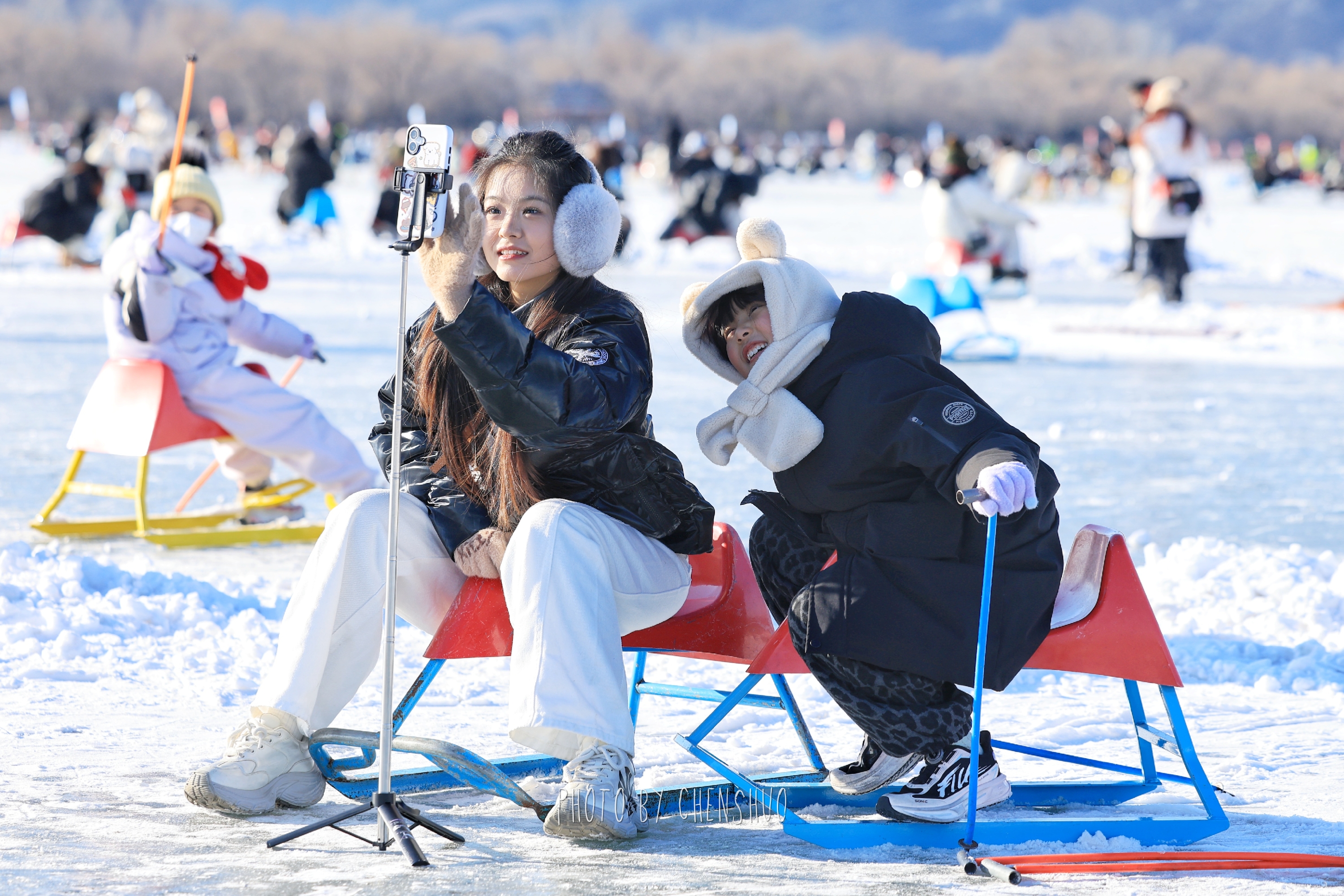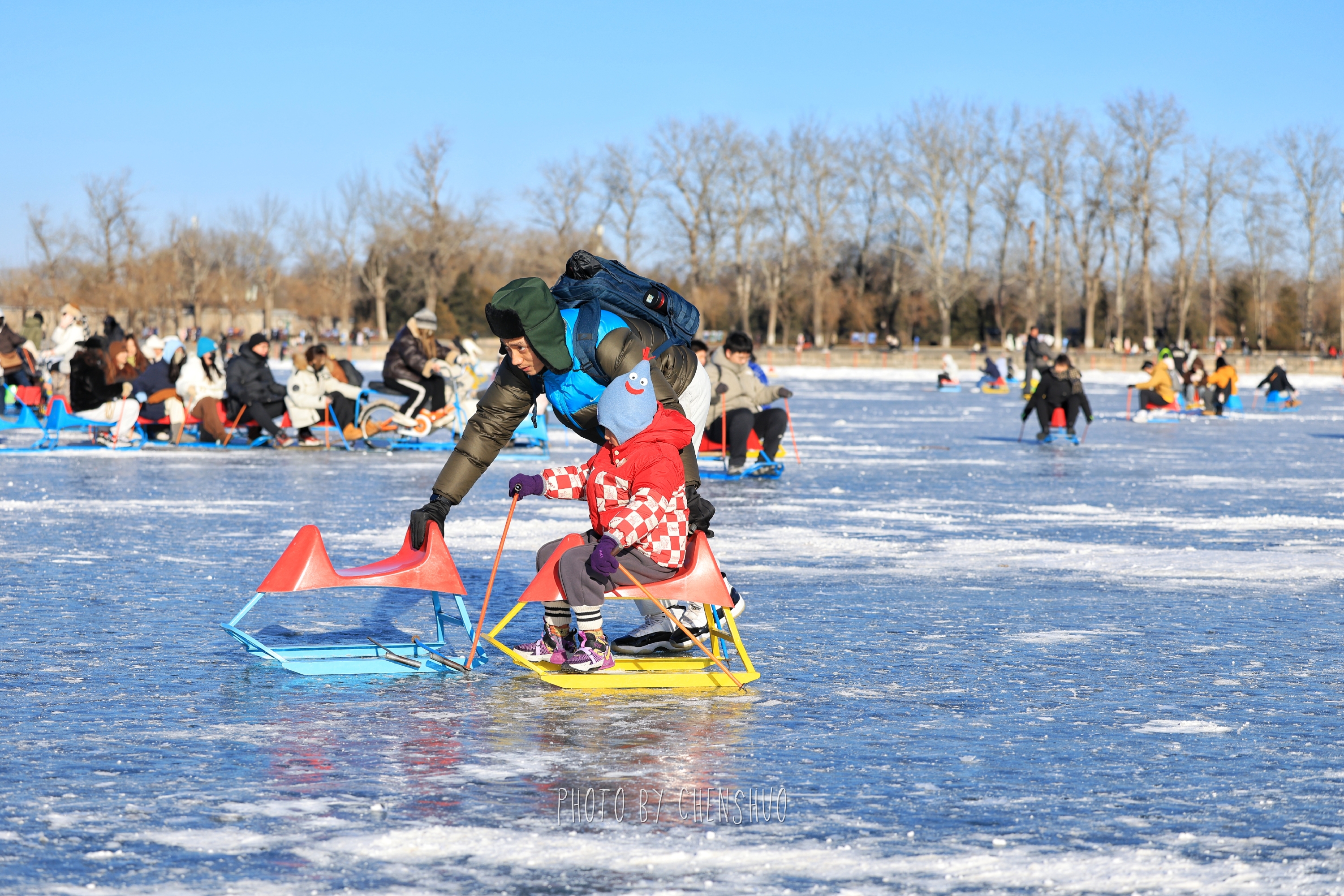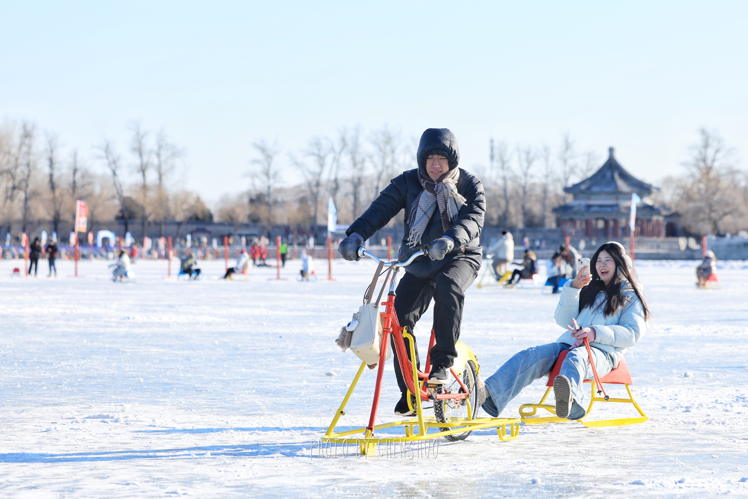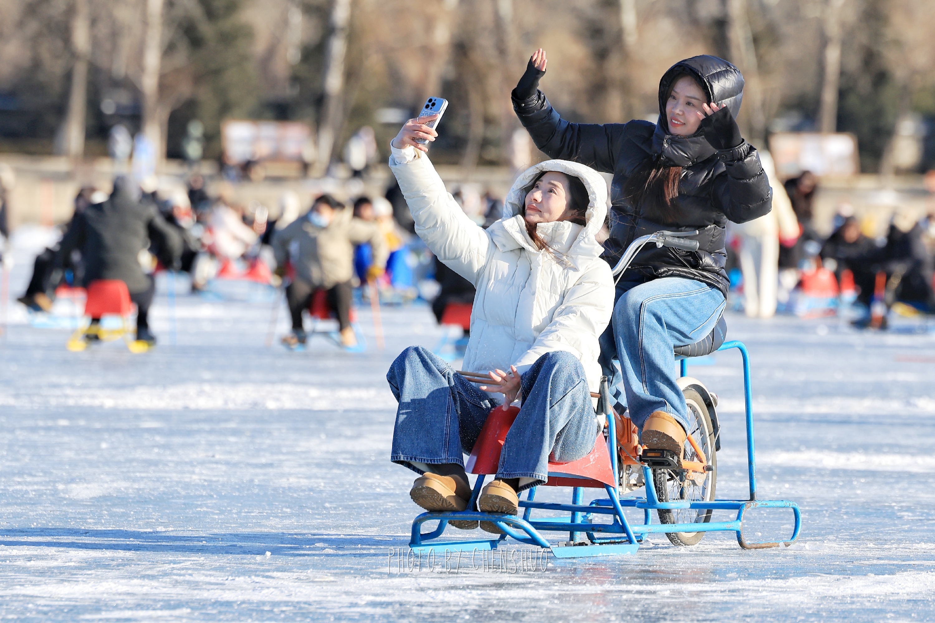 冰面上,单人冰车、双人冰车、单人冰上自行车三类传统冰上设施整齐排列,无论是亲子同游、情侣结伴还是独自寻乐,都能找到适配的游玩装备。孩子们坐着冰车肆意穿梭,笑声清脆;情侣们共乘双人冰车,在冰面缓缓滑行,定格浪漫瞬间;还有游客骑着冰上自行车,体验“冰上骑行”的独特快感,每个人都在严寒中收获着满满的快乐。