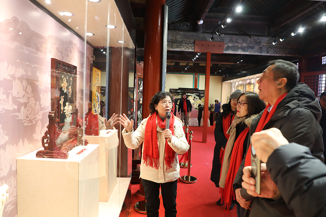本次展览以金漆百宝嵌非遗技艺为主题,集中呈现了代表作“百寿图”,及其姊妹篇“百福图”等代表性珍品。其中,百宝嵌绢花《百寿图》挂屏采用百宝嵌与绢花工艺相结合制成,花繁叶茂、果实累累、福寿绵长。精工矫嵌屏风《锦绣》采用金漆镶嵌中的百宝镶嵌、漆宝砂工艺制作而成,屏芯选用螺钿、兽骨、巴林、寿山天然彩石及各种高档软硬质玉石,精心描绘了山石叠翠、花木繁茂、鸟语花香的景象,寓意锦绣繁华、前程似锦。