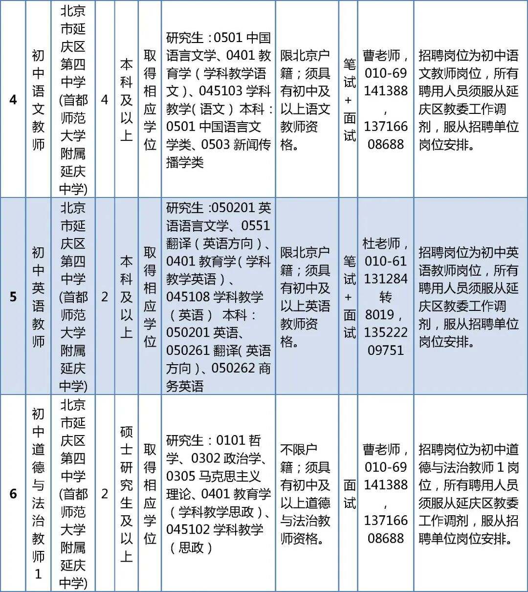 5.区教委将按照申报同一岗位考生综合成绩,结合考生情况、参考考生意愿统筹安排确定入职学校。所有聘用人员须服从延庆区教委工作调剂,服从招聘单位岗位安排。