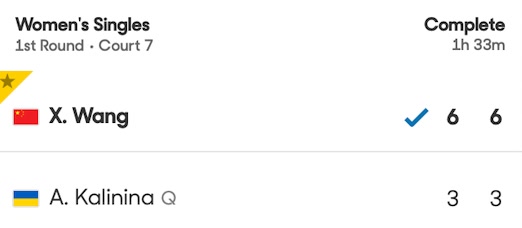 本场比赛,王欣瑜经过开场阶段熟悉和了解后,连破对手两个发球局,6比3先声夺人。第二盘,卡利尼娜打得更果断,直落三局抢占开局。王欣瑜通过防守反击,迅速回破。第八局,王欣瑜打出精彩的网前截击,然后完成破发,由此带出个人发球胜赛局。王欣瑜在局末连得两分,6比3再下一盘,拿下胜利。