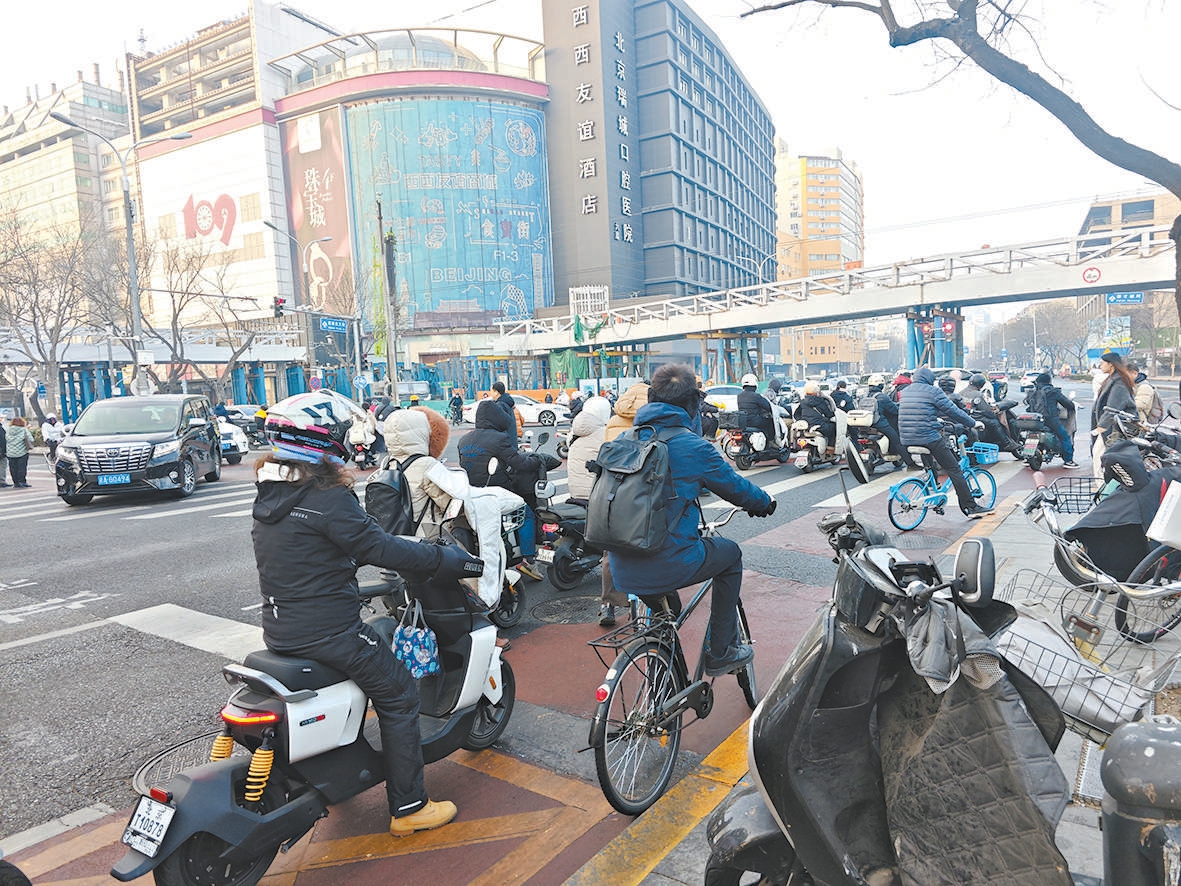 广渠门内大街与白桥大街交叉口的情况更为复杂。1月7日晚高峰时段,路口不仅停止线前聚集大量电动自行车,斑马线上还横着一排非机动车,绿灯亮起后,这些车辆直接在斑马线上骑行,不少行人被挤出斑马线,只能在机动车车流中腾挪。“斑马线本是行人安全通道,现在却成了电动自行车的等候区,太危险了。”市民张先生说。