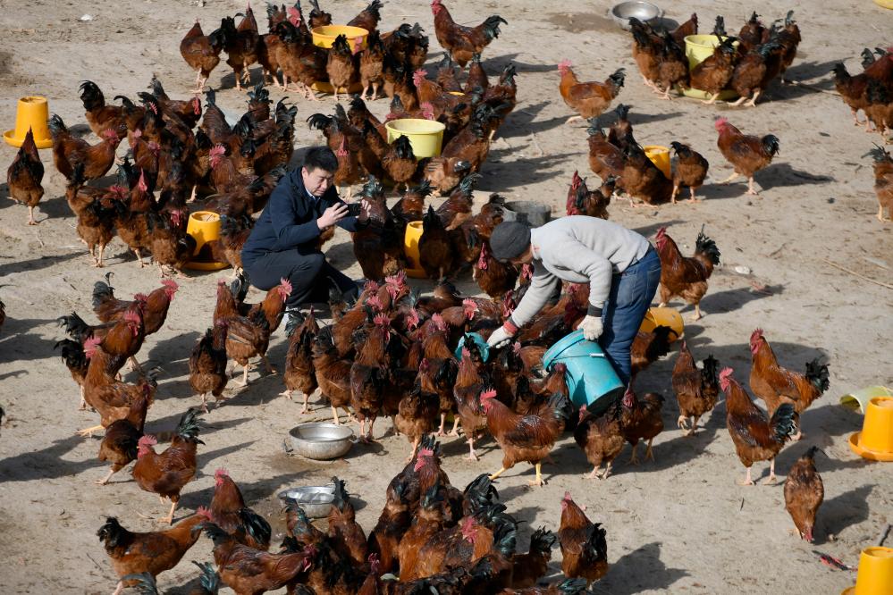 高小聪(左)在山西省吕梁市临县雷家碛乡双井沟村拍摄村民养鸡的视频。
