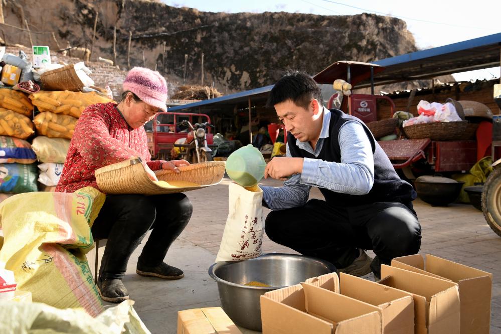 高小聪(右)在山西省吕梁市临县雷家碛乡双井沟村为村民打包网友下单的小米。