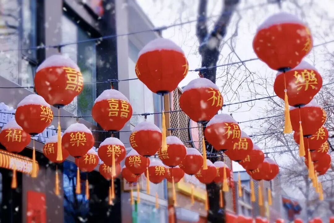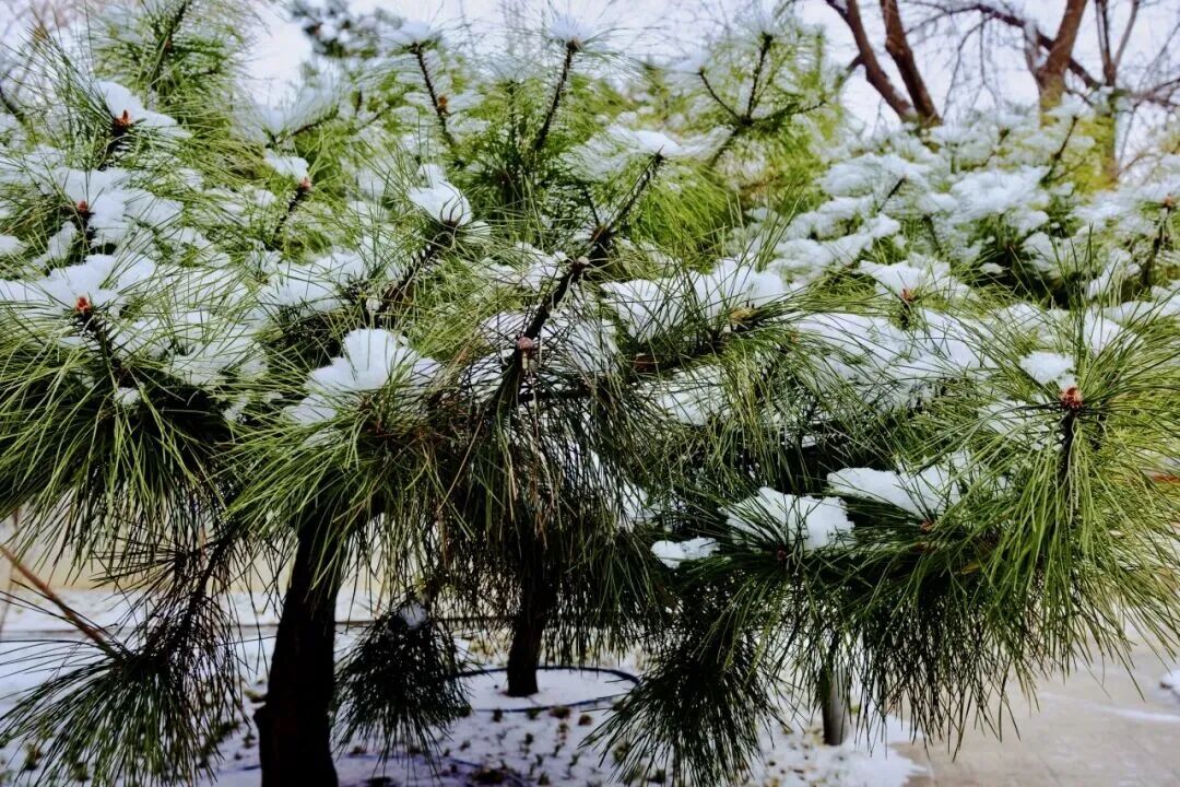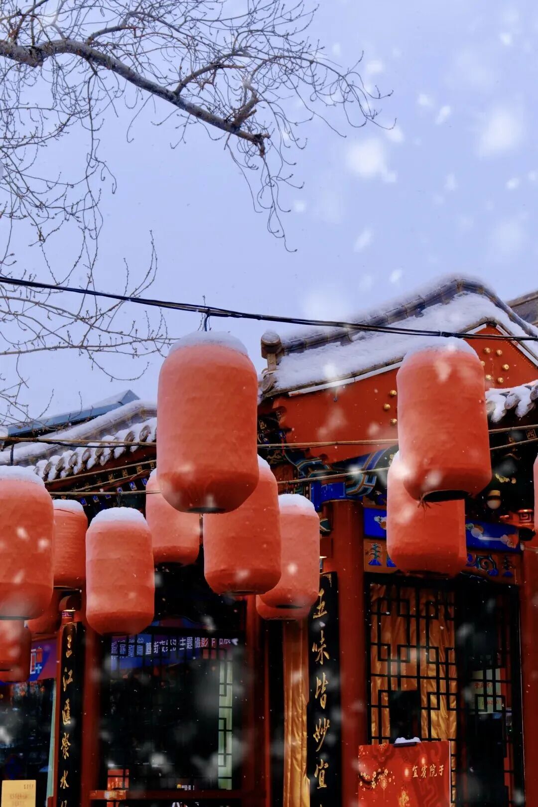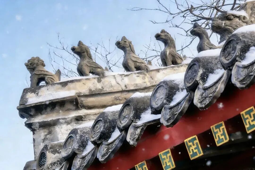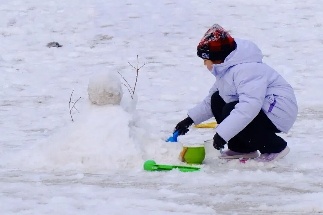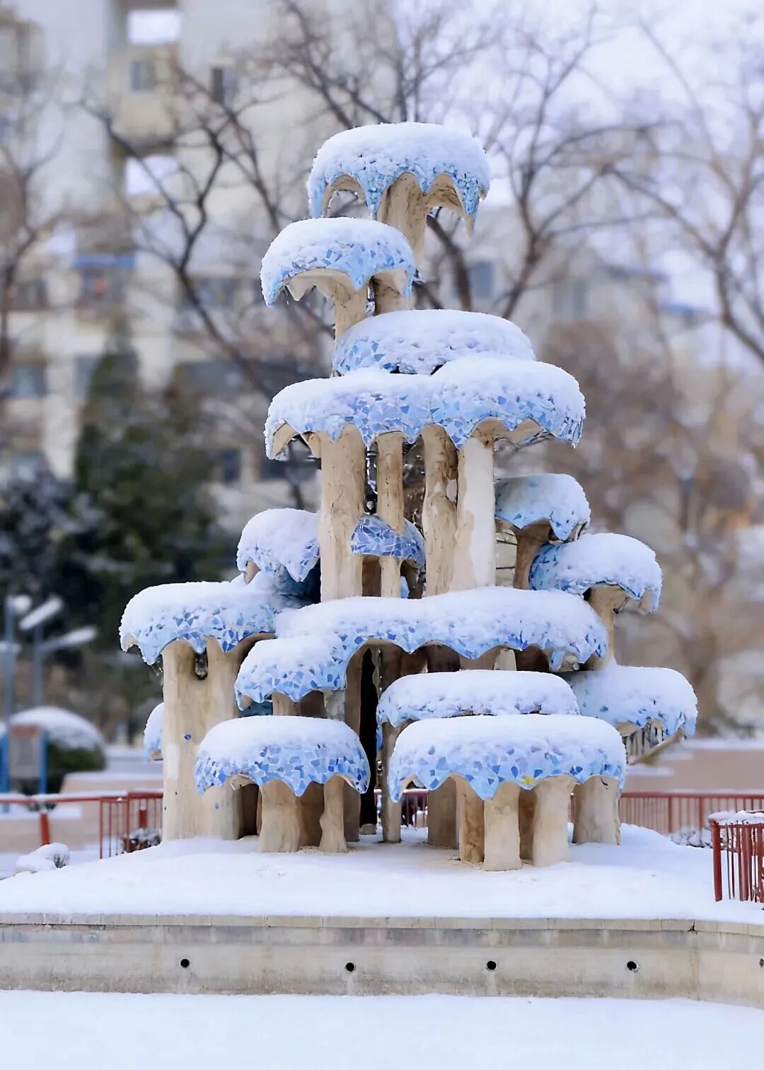 蓝白相间的艺术雕塑覆雪后更添童趣