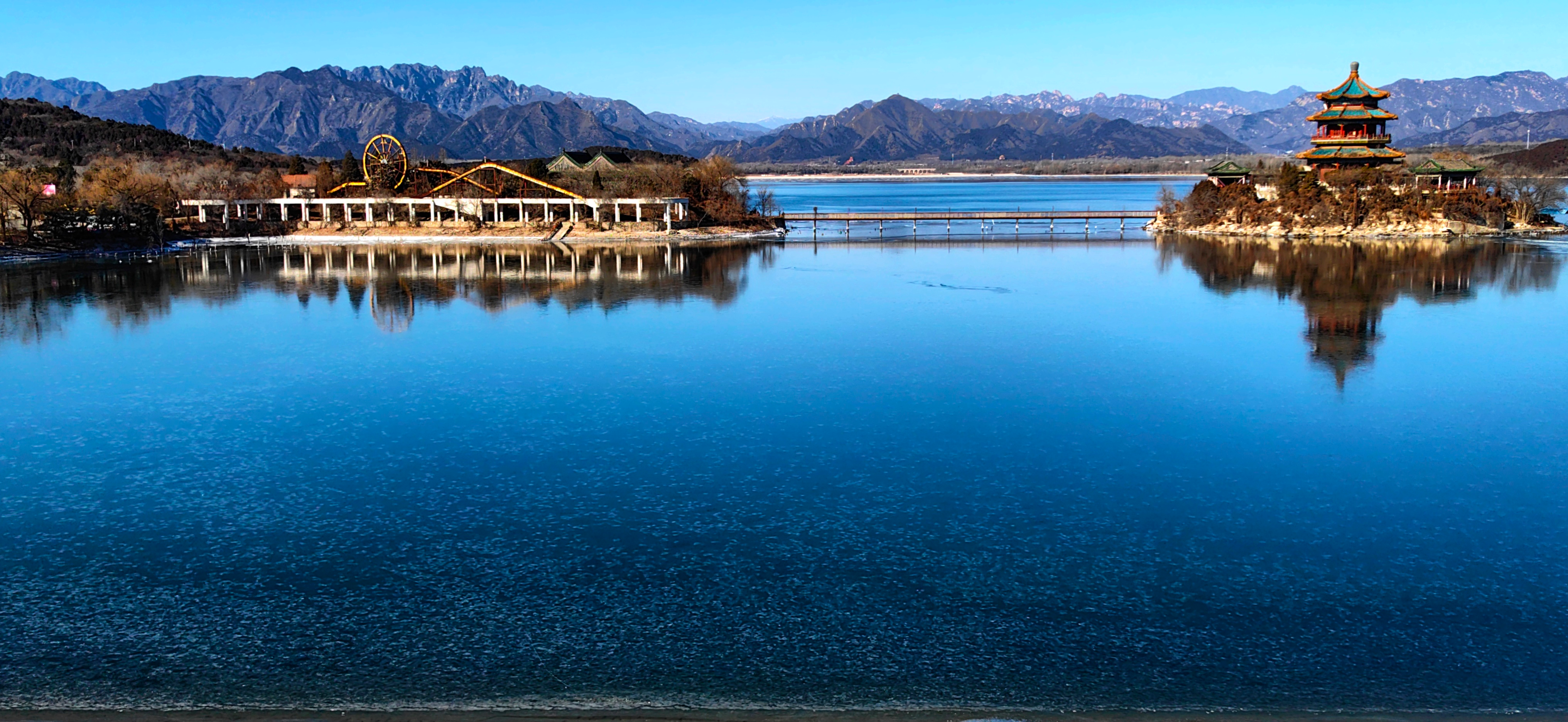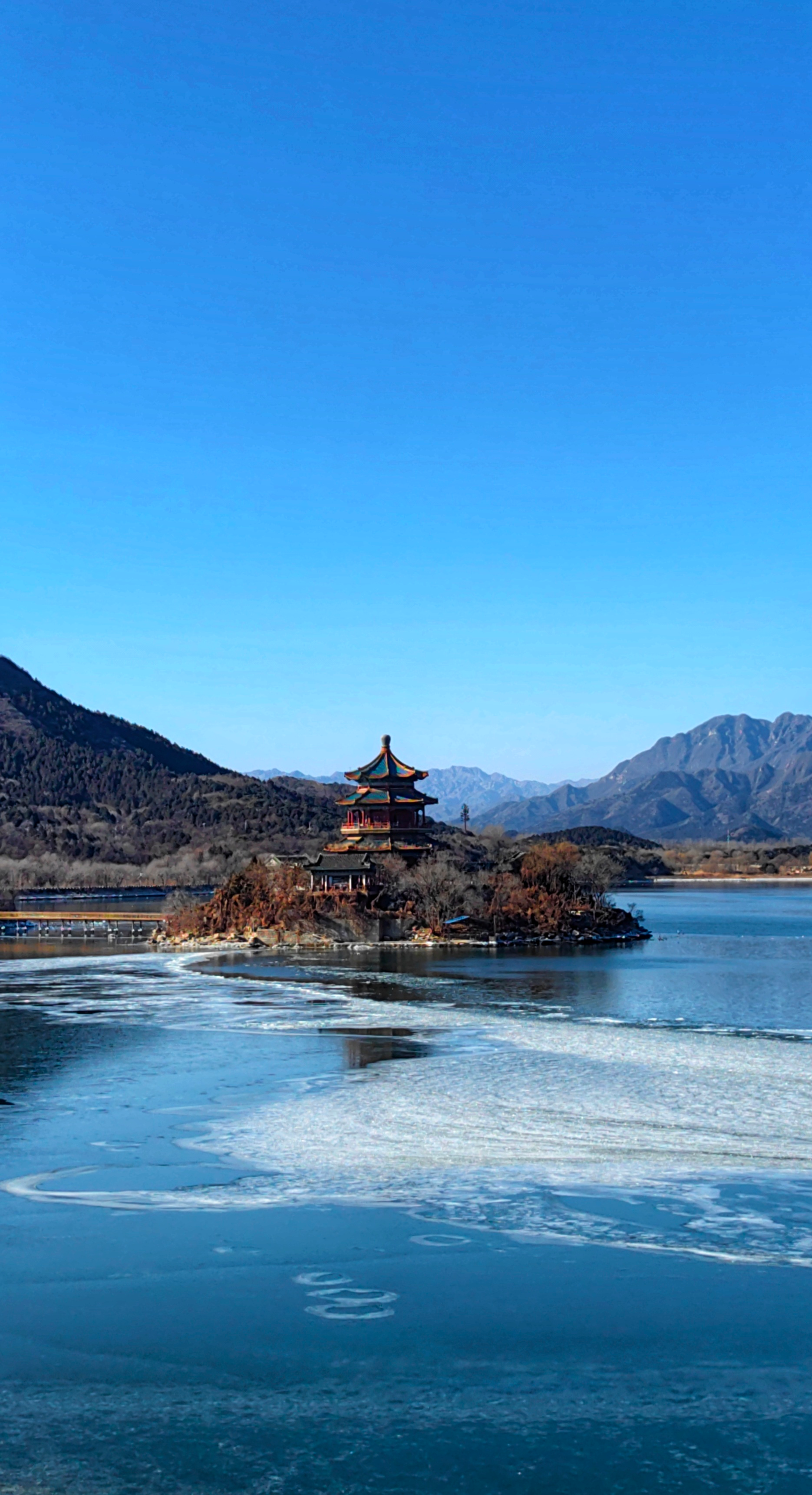 大寒刚过,朔风未歇,十三陵水库却在晴日里舒展着别样的温柔。澄澈的湖面半凝着碎冰,在蓝天映衬下泛着宝石般的蓝,湖心岛上的古建飞檐翘角,倒影在冰与水的交融里轻轻摇晃。远处层峦叠嶂,近处坝岸静谧,寒意在暖阳中渐渐消融,只剩这一湖清冽与山影相依,静候着春的脚步。