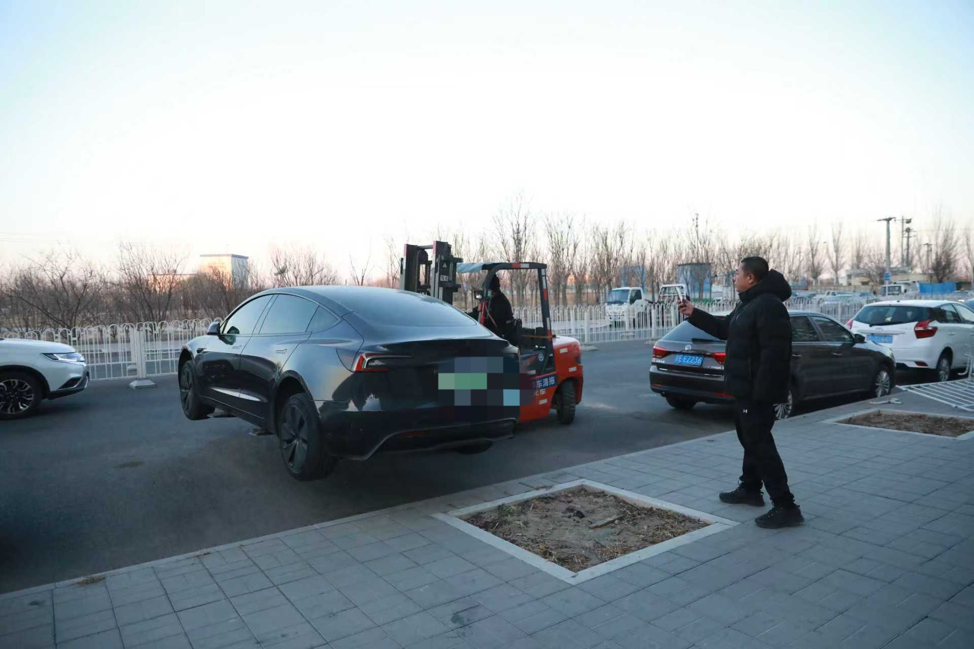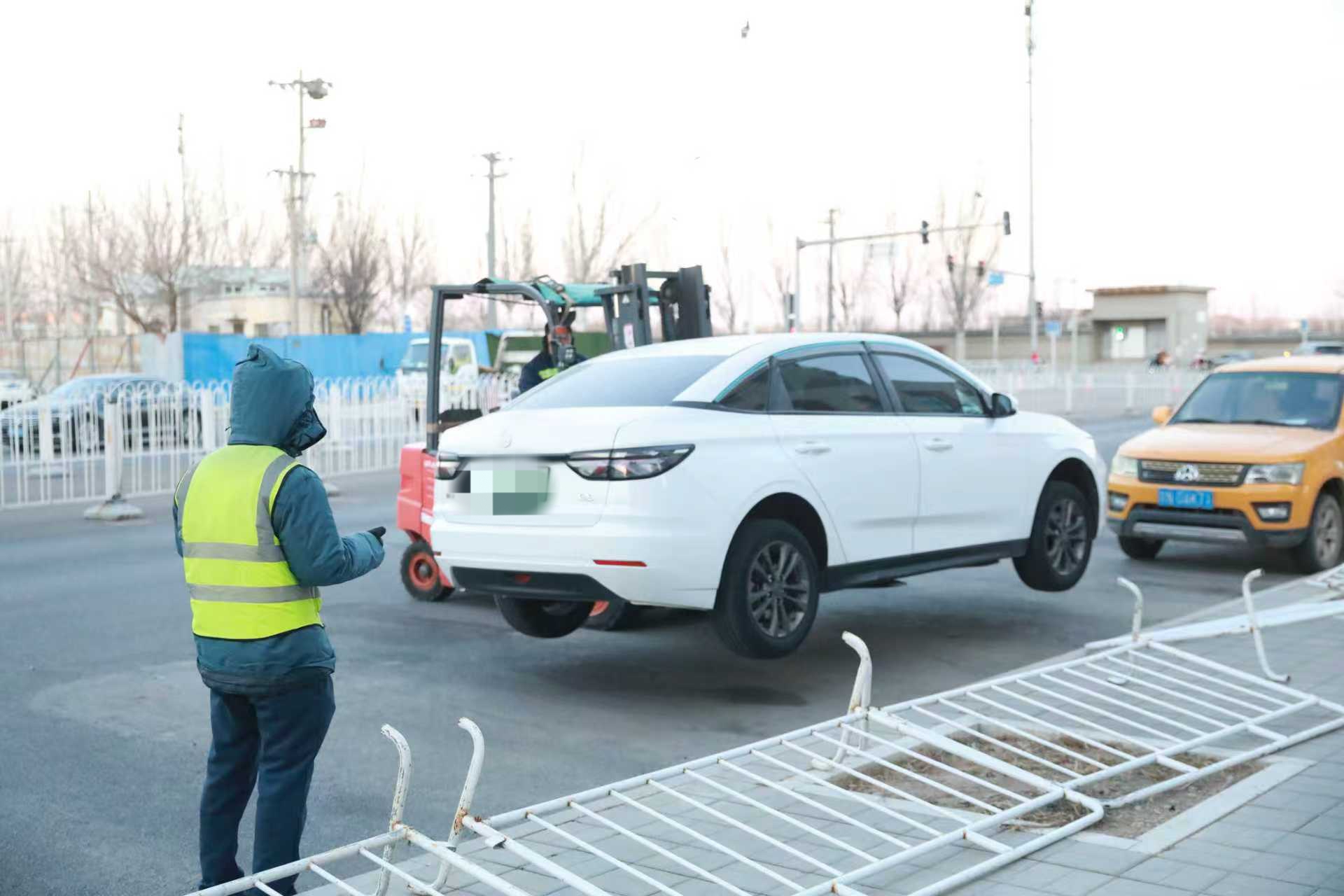 考虑到路侧违规停车影响施工的情况,工作人员提前利用叉车等设备挪移车辆、规范停放,并进行全程录像记录,既保障了施工顺利进行,也体现了管理工作的细致与透明。