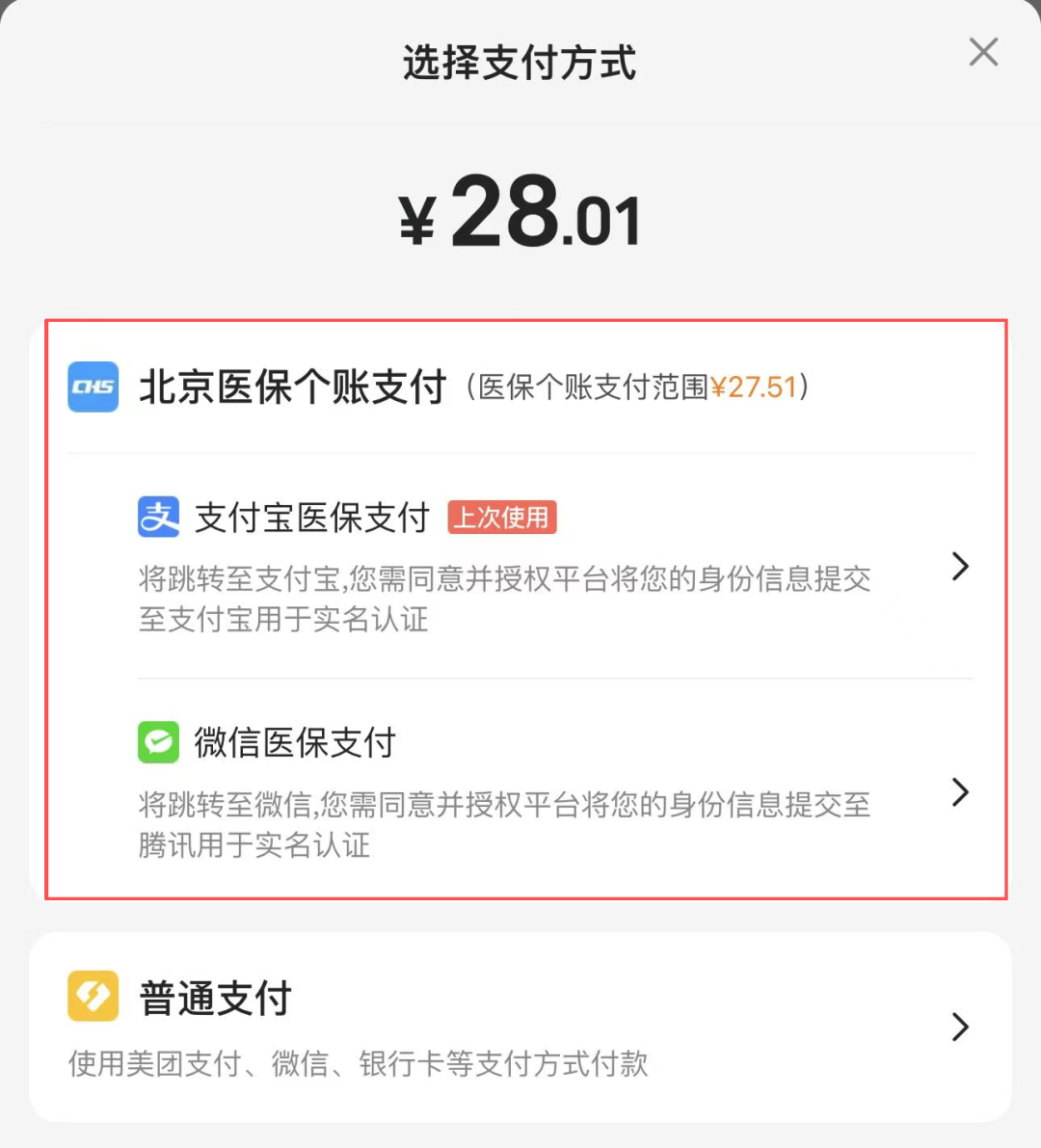 在支付方式中选择支付宝医保支付或微信医保支付,系统会自动跳转至相应APP。
