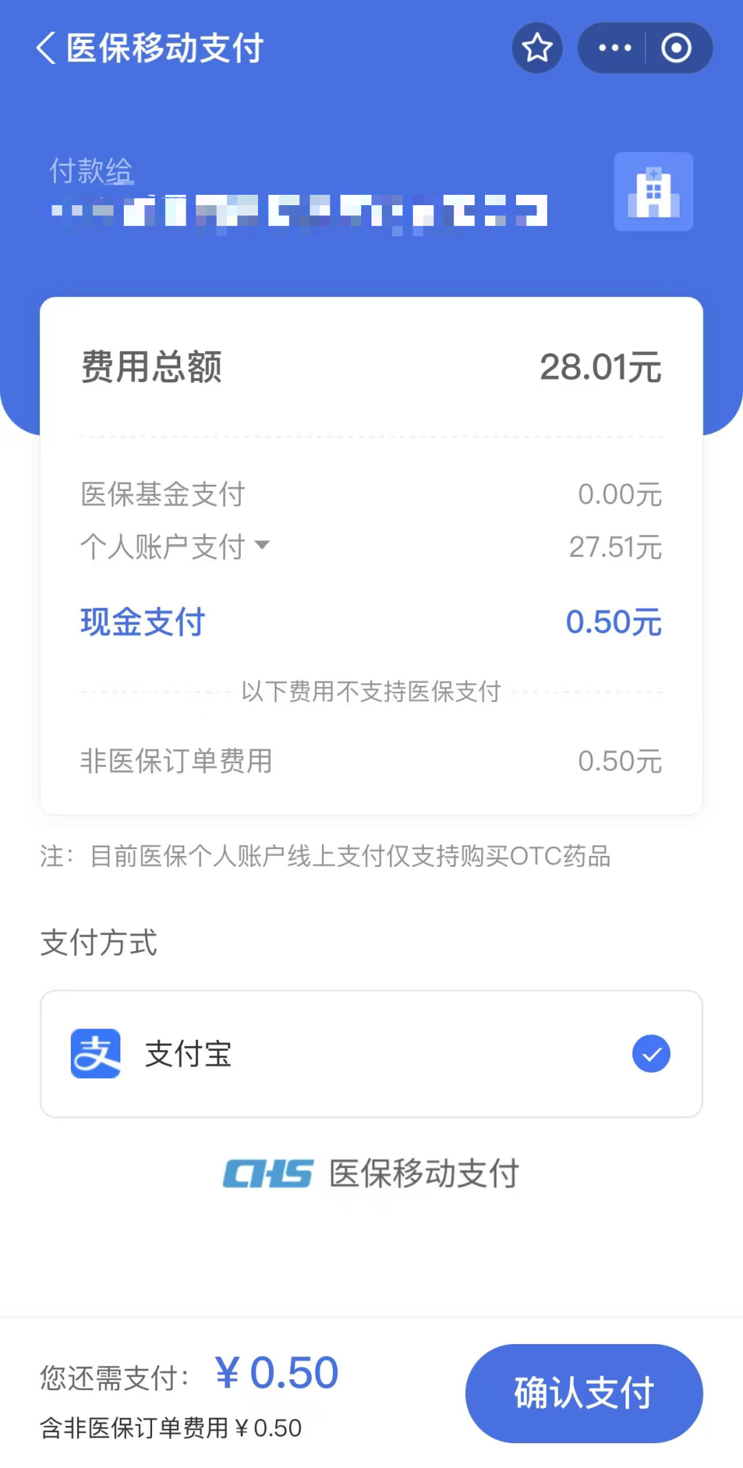 系统跳转至支付界面点击确认支付即可完成(非医保订单费用为包装费、配送费或自费药品)。