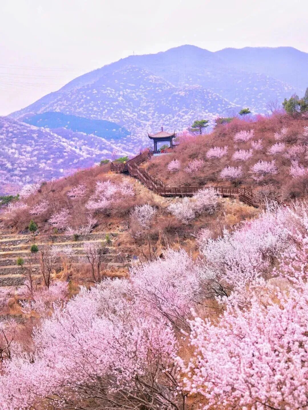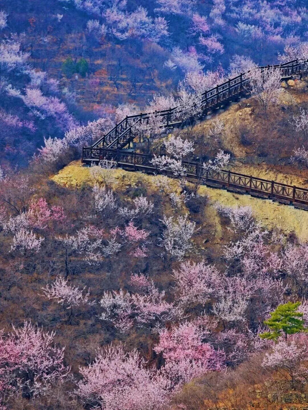 崔村镇的西峪橡树谷木栈道则以3000多亩罕见的原始橡树林为核心,打造出全长约11公里的生态走廊。这条绿道最大程度展示了橡树生态系统的独特魅力,春季新花初绽,阳光透过花瓣洒下斑驳光影,近一个月的花期内每日皆有不同色彩呈现。木栈道设计兼顾景观体验的节奏感,不同风格的观景平台错落分布,或面向开阔山谷,或藏于密林深处,让行走的过程充满发现与惊喜。作为免费开放的休闲绿道,这里户外强度等级低,成为市民“森呼吸”的解压圣地。