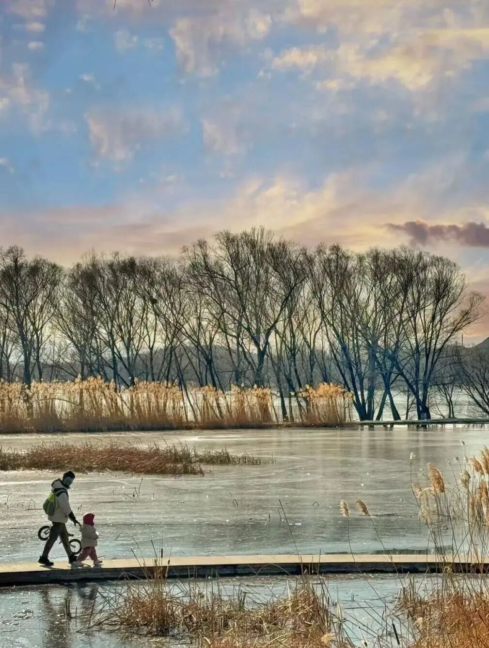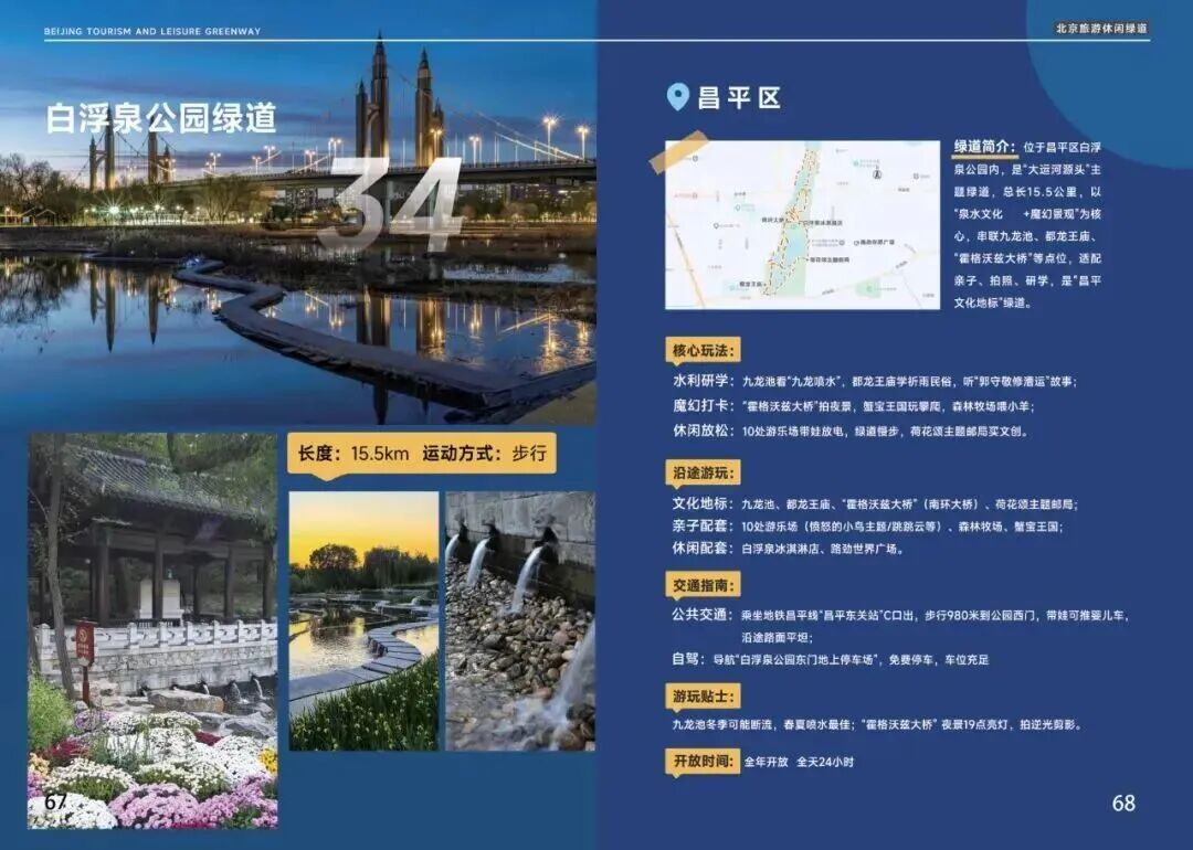 四条绿道中,白浮泉公园绿道则是历史与现代交融的代表。作为京杭大运河重要水源地,白浮泉遗址的历史文化价值通过这条绿道得到全新诠释。绿道以白浮泉遗址为核心向周边延伸,总长约15.5公里,景观从古朴的历史遗迹逐步过渡到现代滨水休闲空间,既成为开展历史教育的户外课堂,也为市民提供了散步、健身的休闲滨水空间,更是连接昌平新城与老城的重要绿色纽带。傍晚时分,当地居民漫步绿道,历史遗址与现代生活在此和谐共生,尽显昌平的人文底蕴与生活气息。