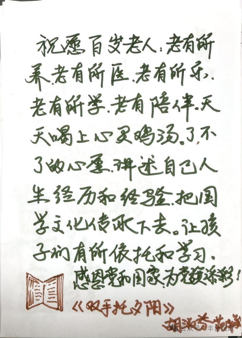 西罗园街道的祝福卡书写区,孩童、青年、长者纷纷提笔,写下对百岁老人的真挚祝愿。这些卡片经社工整理,与老人回赠的长寿卡一同完成双向传递。百岁老人收到后常请子女逐字朗读,有的还录制感谢视频,让温暖与感动在社区循环流动。
