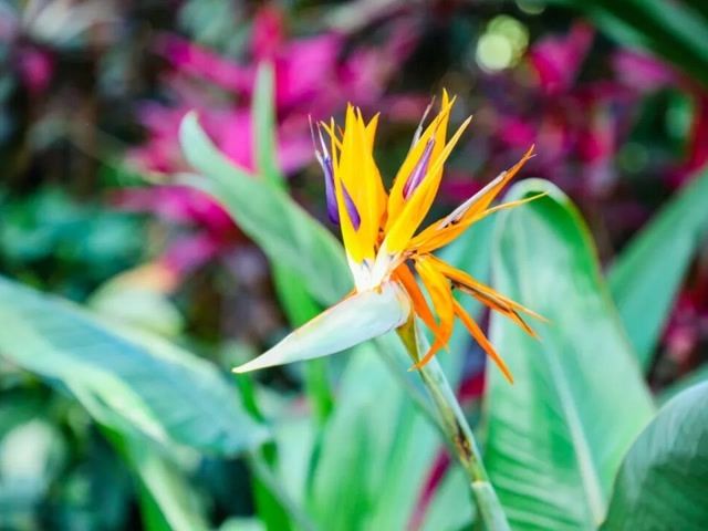 鹤望兰是鹤望兰科鹤望兰属多年生草本植物,无木质树干;叶片长圆状披针形。花数朵生于总花梗上,下托一佛焰苞;佛焰苞舟状,绿色,边紫红,萼片披针形,橙黄色,箭头状花瓣基部具耳状裂片,暗蓝色。这株植物还有个浪漫的别名——天堂鸟。详情>>