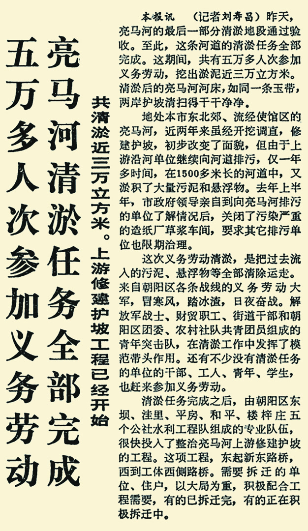 在一年多的时间里,共有五万多人次参加了整治亮马河的义务劳动,挖出淤泥近3万立方米。清淤后的亮马河河床,如同一条玉带,两岸护坡清扫得干干净净。清淤后,水利工程队开展了亮马河上游修建护坡工程,相关地区的一些单位和居民相继搬迁。(1984年1月16日《北京日报》1版,《五万多人次参加义务劳动 亮马河清淤任务全部完成》)