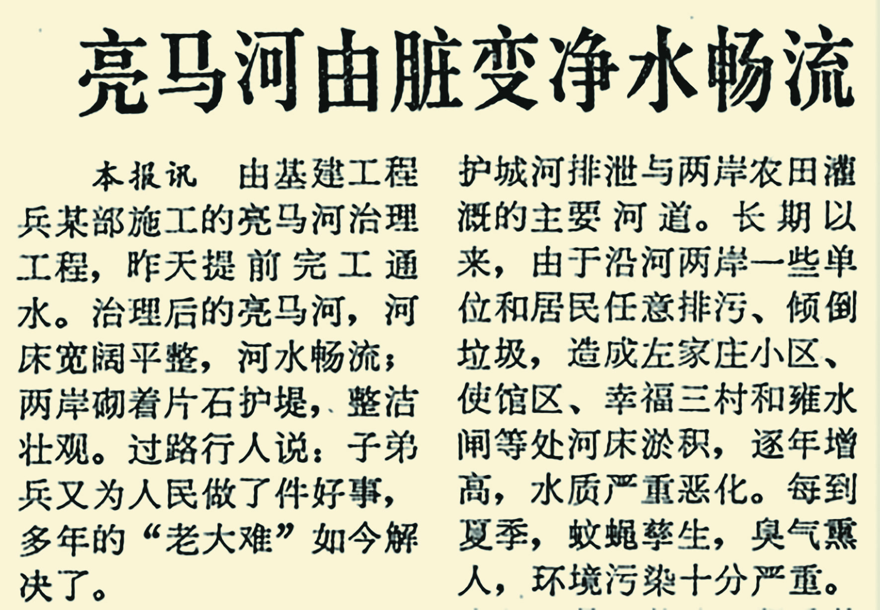 工程由基建工程兵某部承担,为了早日改变这一地区的环境卫生面貌,两千多名子弟兵顶风寒,踏冰雪,日夜奋战在工地上。从1982年1月到3月的60多天里,子弟兵们共挖运土32万多立方米,砌护堤片石近1万立方米。经过治理,河道初步得到了疏浚,河水畅流,片石护堤,整洁壮观。(1982年3月11日《北京日报》1版,《亮马河由脏变净水畅流》)