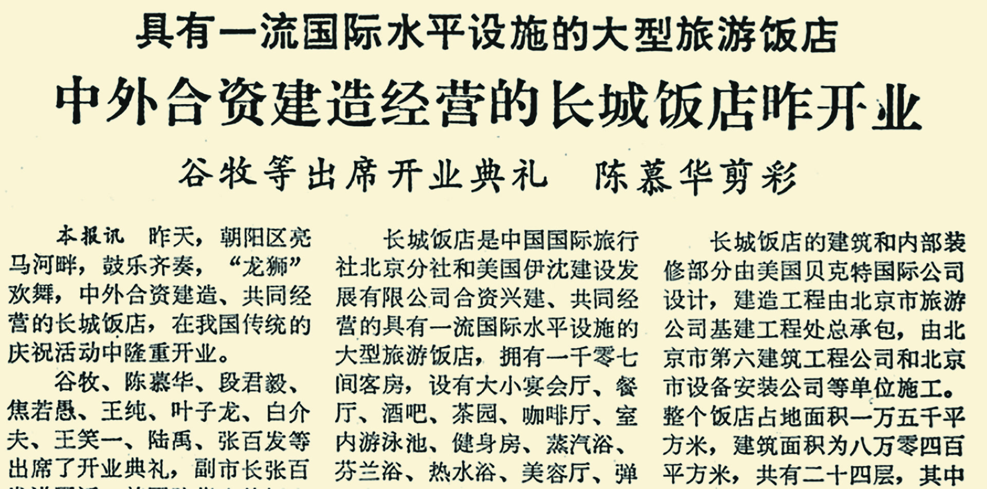 1984年6月,中外合资建造、共同经营的长城饭店在亮马河畔正式开业。这座二十多层高的饭店是国内首次采用全玻璃外墙的现代建筑,拥有上千间客房和宴会厅。(1984年6月21日《北京日报》1版,《中外合资建造经营的长城饭店昨开业》)