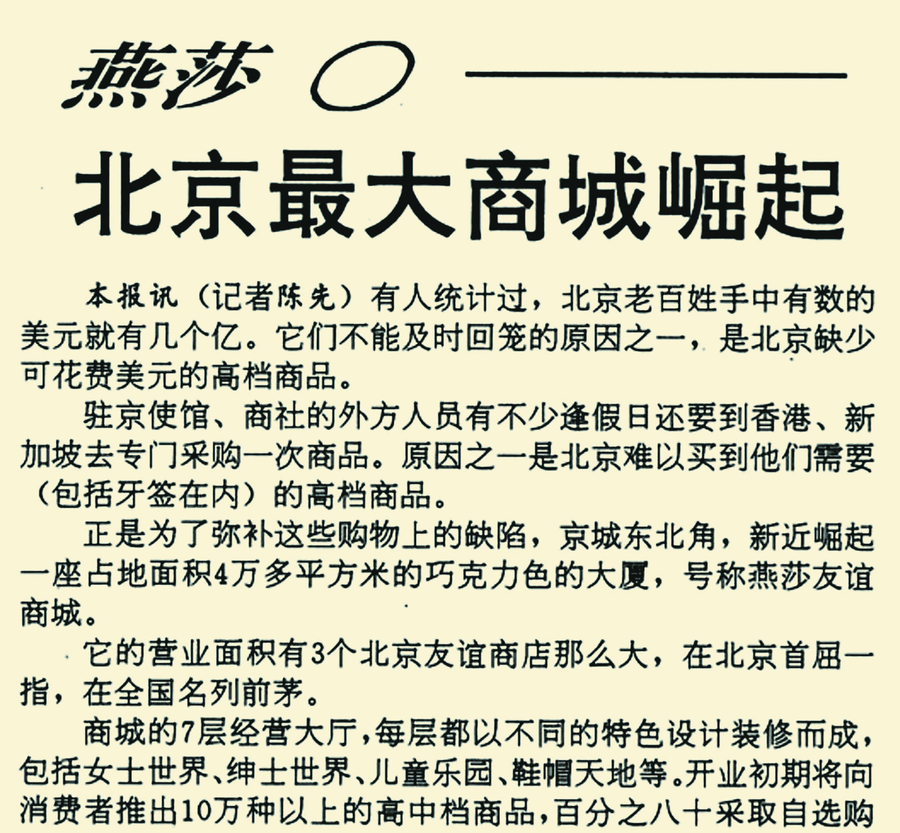 1992年,一座巧克力色大厦在亮马河畔拔地而起。它就是国内第一家中外合资的大型零售商业企业——燕莎友谊商城。这座建筑面积近4万平方米的商城,是当时全国最大的涉外商场。法国的化妆品、意大利的皮鞋、香港的月饼等10万多种来自世界各地的商品大部分以自选的形式出售,让京城市民大开眼界,也让不少外地游客慕名前来。(1992年5月15日《北京日报》1版,《燕莎 北京最大商城崛起》)
