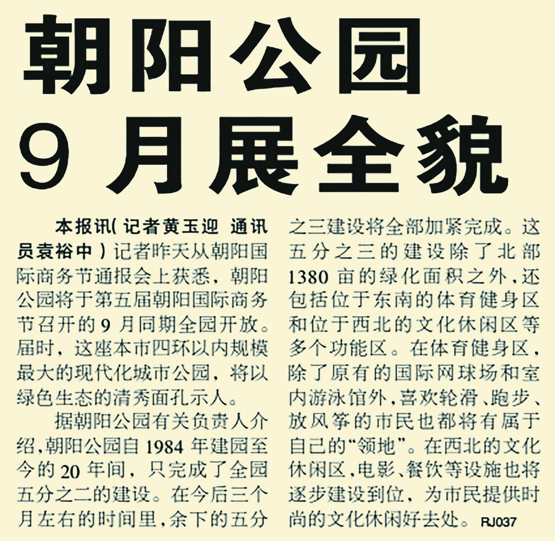朝阳公园始建于1984年,最初只是一个有湖的郊野公园。随着亮马河地区的腾飞,朝阳公园的区位优势凸显。新世纪以来,在市政府的支持下,朝阳区加大了对朝阳公园的治理力度,进行了大量拆迁整治工作。朝阳公园成为北京市区内规划面积最大的公园。2004年国庆节前夕,朝阳公园全部建成开放,成为一座以开阔水面、大片绿地为主的绿色生态公园。(2004年6月11日《北京日报》6版,《朝阳公园9月展全貌》)
