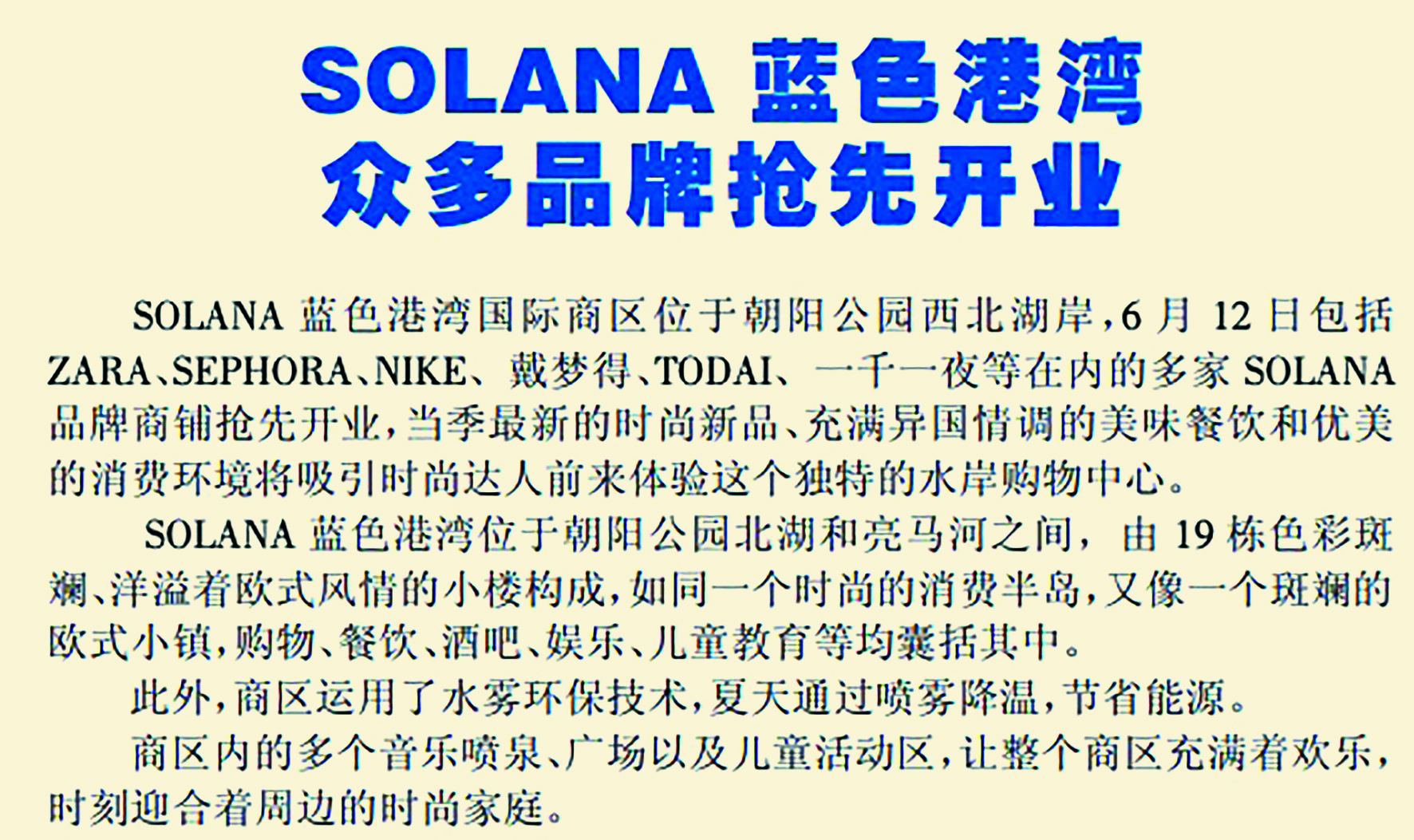 在朝阳公园不断升级改造之时,位于公园西北湖岸、亮马河南岸的一座欧陆风情商业休闲小镇也开始动工兴建。在这座被命名为SOLANA蓝色港湾的小镇中,19座地中海式建筑依湖而建,鹅黄的外墙、淡粉的窗棂在周围层层叠叠的绿色掩映下充满了梦幻和童趣。购物、餐饮、酒吧、娱乐、儿童教育等均囊括其中,让消费者享受到不同以往的消费体验。(2008年6月13日《北京晚报》54版,《SOLANA蓝色港湾 众多品牌抢先开业》)
