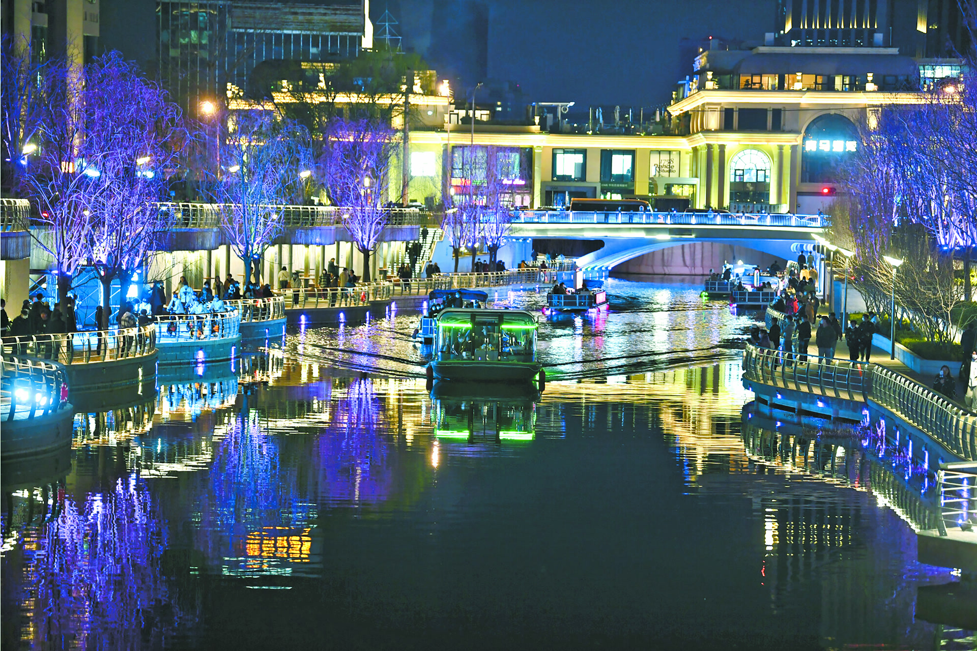 2021年夏季,燕莎购物中心至蓝色港湾约2公里的河道通航,亮马河国际风情水岸成了网红打卡地。傍晚时分,游客登船远眺,亮马河沿线的桥梁、楼宇、树木,都被灯带装点得璀璨绚烂,水上清风,河心秋月,让都市人找到了松弛感。除了乘船观光,还能下河。水务部门扩大河湖开放共享,在亮马河燕莎桥上游约900米的河段,开设了桨板、皮划艇、赛艇等水上运动试点,吸引不少热爱运动的人前来尝试。(2023年10月4日《北京日报》1版,《风情亮马河 时尚会客厅》)