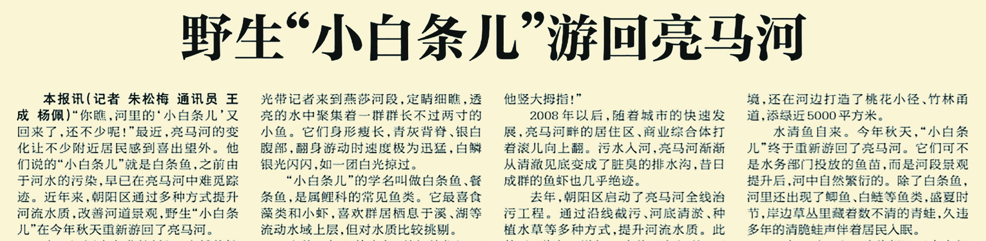 2016年,朝阳区启动了亮马河全线治污工程;通过沿线截污、河底清淤、种植水草等多种方式,提升河流水质,并增加水内氧气,为鱼类生长、繁殖提供条件。(2017年10月9日《北京日报》6版,《野生“小白条儿”游回亮马河》)