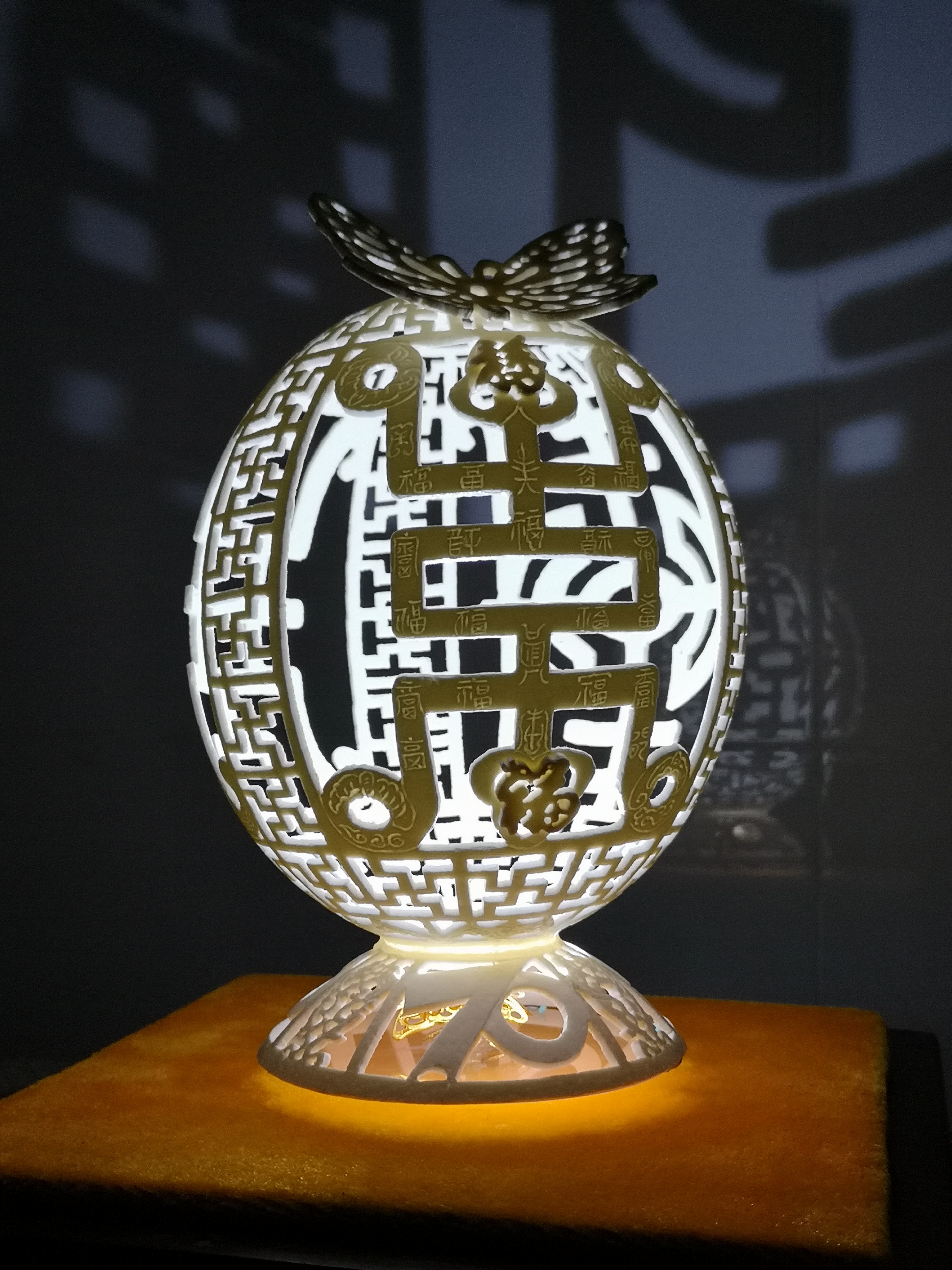 毕凯以在野外降雪观测工作中获得的数千张海陀山雪花微观相态作为素材,通过艺术转化后,创作了庆祝中华人民共和国成立70周年的鸵鸟蛋壳雕作品《福寿绵长》,以微观雪晶的秩序之美,进行气象科普。