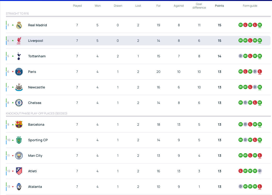 根据规则,本赛季欧冠联赛第一阶段前8名将直接晋级16强。第9名至第24名的16支球队将捉对进行两回合的附加赛,决出另外8个16强名额。