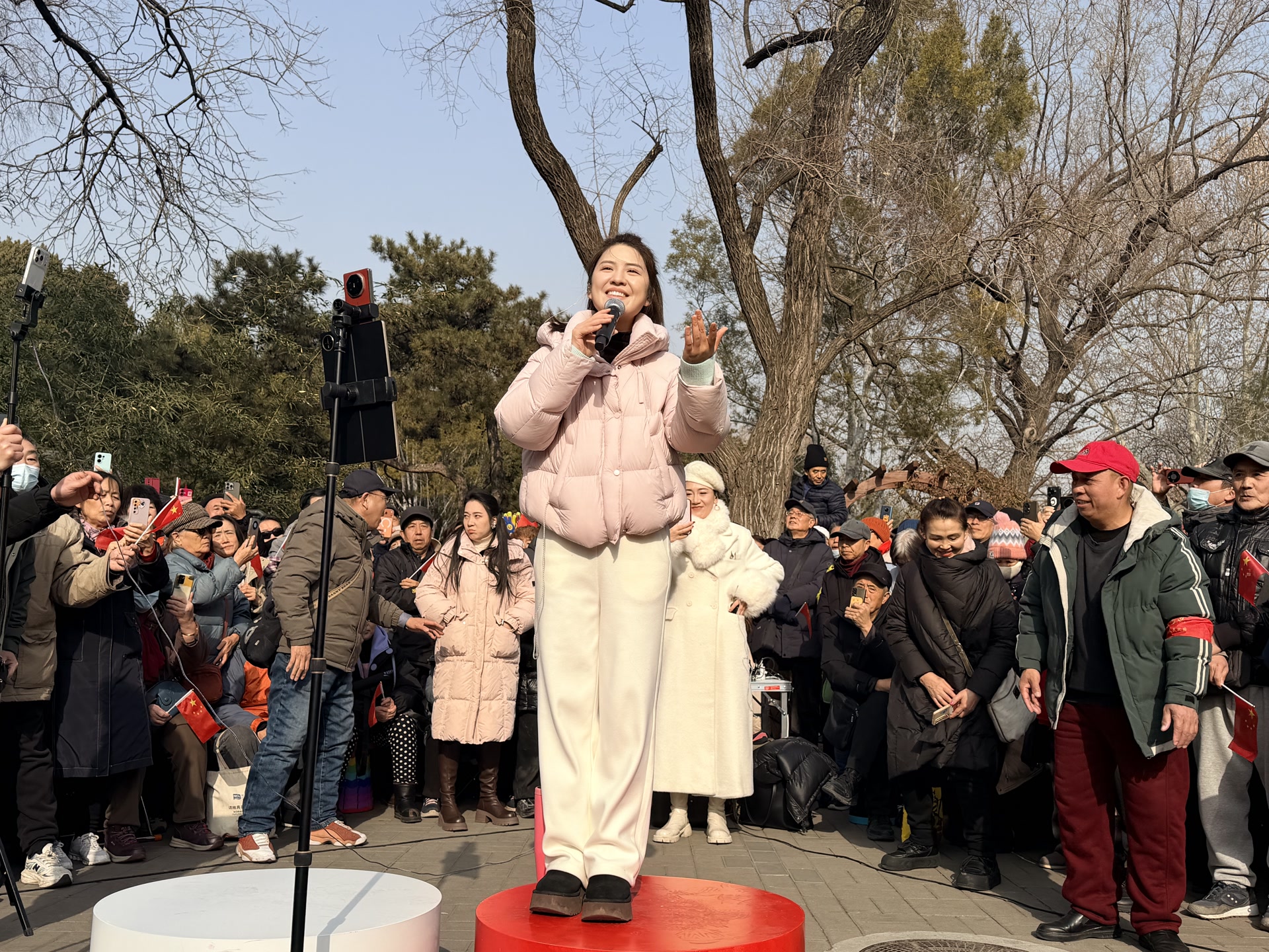 这次经历,让胡启越坚定了把红歌唱到群众身边的决心。她拉着音响、扛着话筒,第一次走进紫竹院公园演出。从专业舞台转战公园广场,胡启越不仅要演唱,还要包揽主持、暖场、互动的任务,这些对曾有些社恐的她来说是不小的挑战。渐渐地,驻足的观众越来越多,从最初的几十人到上千人,最多一场演出吸引了上千名观众。如今的她从容大方,还会邀请大爷大妈上台合唱。“就是这份接地气的真诚,还有这姑娘对红歌的一腔热忱,让我们大伙儿都打心眼儿里喜欢她!”观众朱大妈说。