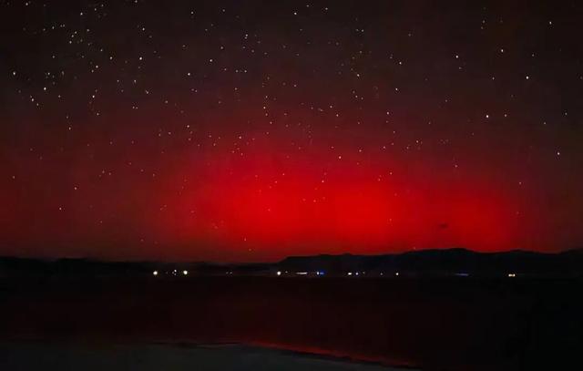 祖国的另一端,游客刘先生在新疆赛里木湖也拍到了极光,和黑龙江漠河绿色调的极光不同,刘先生拍到的图片显示,赛里木湖被红色极光笼罩。