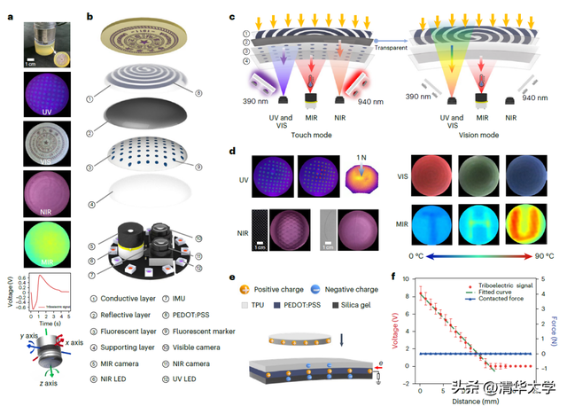 SuperTac创新性地将中红外至紫外波段的多光谱成像与摩擦电信号相结合,设计了基于导电聚合物、荧光层、反射层和支撑层的多层超薄感知皮肤。SuperTac具备力感知范围调整能力,实现了微米级的高分辨率和多模态高精度测量(力、位置、温度、接近、振动),并且对于不同物理属性如材质、纹理、滑动、碰撞和颜色等信息的感知精度均超过94%(图3)。