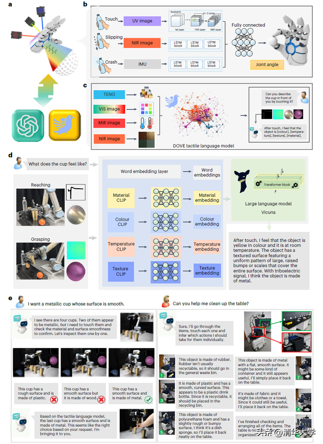 为了充分挖掘传感器的多模态感知潜力,团队还自主构建了拥有8.5亿参数的触觉语言模型DOVE,能够理解丰富的触觉信息,赋予机器人类人触觉感知和环境理解能力(图4)。目前,SuperTac(图5)已成功集成至机器人灵巧手中(图6),支持远程实时状态反馈,有望在制造、医疗、服务机器人等领域发挥变革性作用。